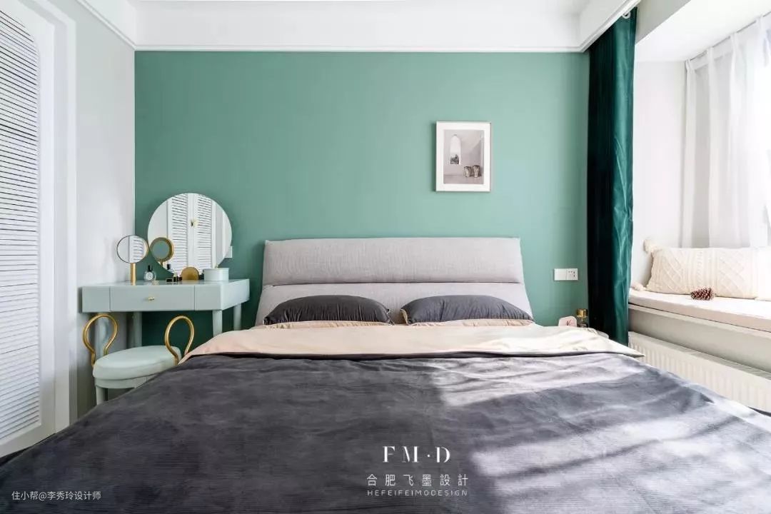 有飘窗的户型,卧室仿佛多了一些可能性。利用飘窗墙角的鸡肋空间增加梳妆台设计,更有整体性,这样的梳妆台也有了可以辅助化妆的自然光源。