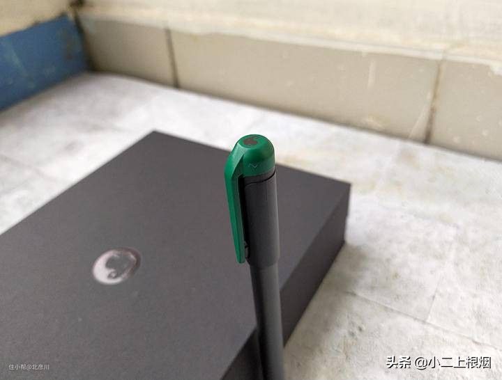 整只笔同样采用的是墨色加绿色的配色,十分的轻盈,笔的末端是充电插口和复位孔,