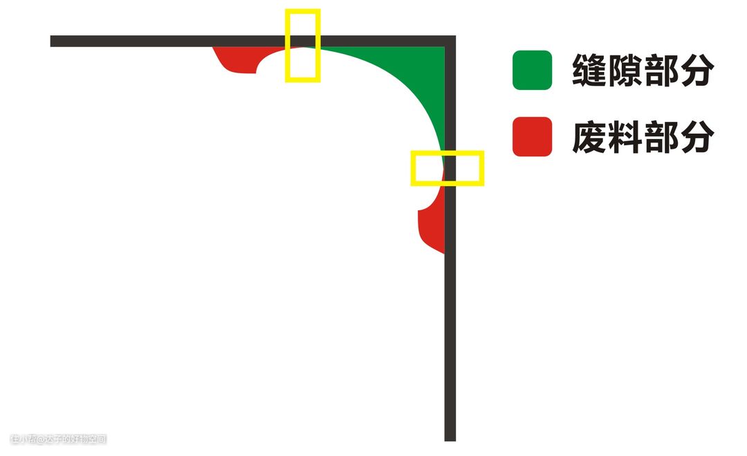 我第一次做就失败了。最理想的阴角压完缝之后的效果是下面这张示意图的样子。黄匡区域是缝隙部分和废料部分交接的区域,这个区域要压的尽量薄一点,这样后期撕掉的时候才好撕。
