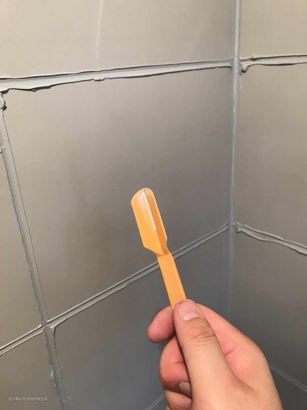 美缝剂干掉以后,就需要用刮刀清理了。建议买上刀片的刮刀,好用!那种一体成型的铲刀,不好用,慎买。