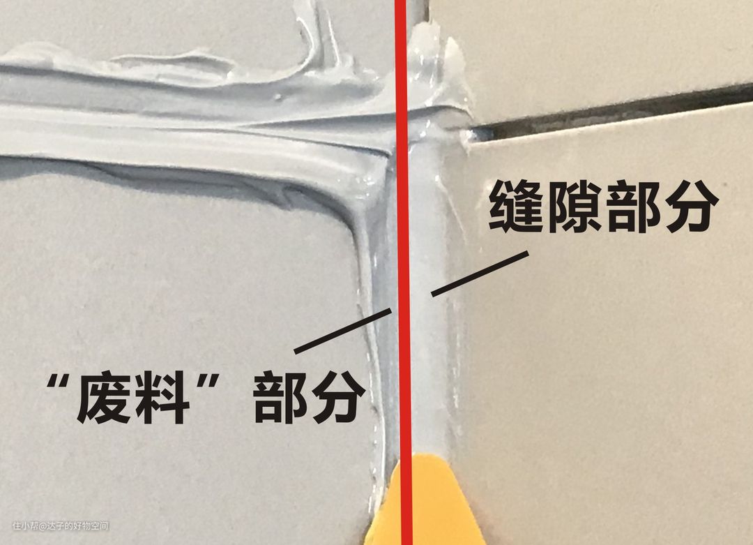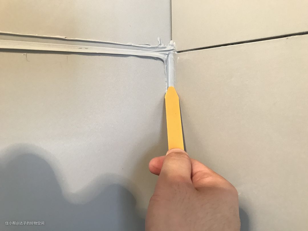 相对于阴角,阳角就好办的多了。阳角在填充美缝剂的时候,一定要多打一点(阴角也是),这样对于后面压缝和最终的余料分离是非常有帮助的。