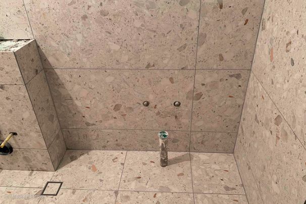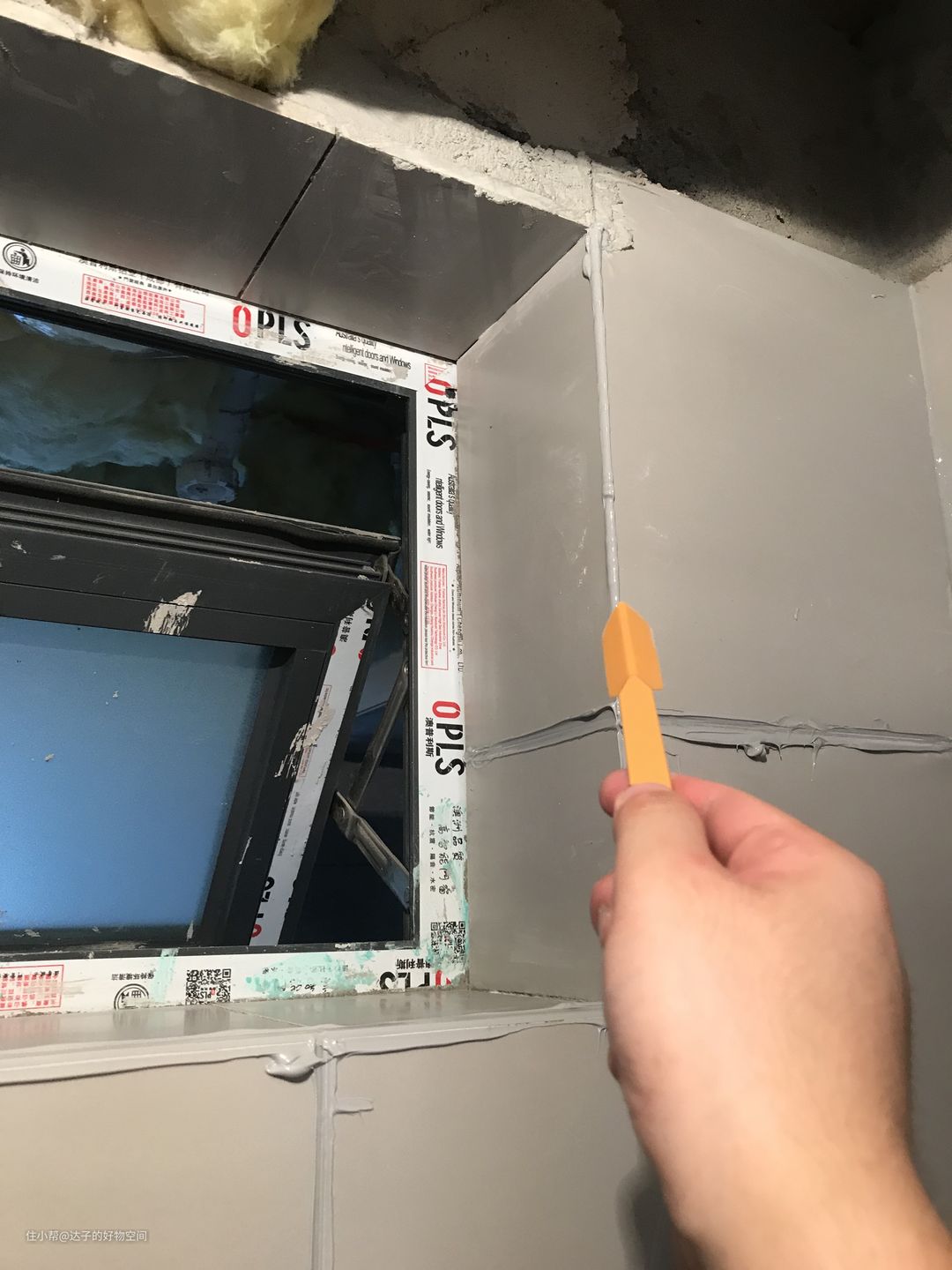 7、先从会被家具遮挡的地方开始练手。同时也提醒大家,被挡住的地方也要做美缝!不能省!有的商家会告诉消费者,柜子挡住的地方不用做美缝!这是非常错误的!柜子和墙面不可能做到密封,因此潮气会从没有美缝的瓷砖缝隙进入到里面。长期来看,这显然是不好的;