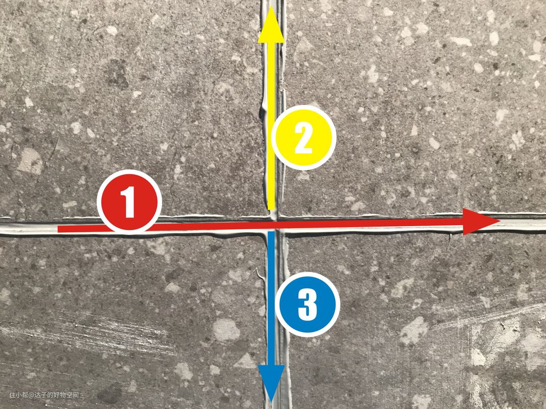 在压缝的时候,会遇到交界的“十字口”,大家可以脑补一下,先压横线,再压竖线的话,横线上十字口的位置就会被竖线的美缝剂盖住,最终会凸出来。解决这个的方法是有十字口的区域压缝分三步走。具体步骤参考下图。当然也可以竖线是1,横线是2、3,根据你的习惯来吧。