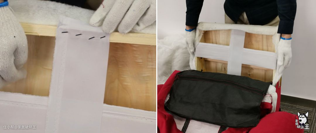 紧接着后面就是一些白色的宽布,一条竖的,两条横的,连接处用枪钉与后面的复合板框架做固定,靠背就用这个做支撑。