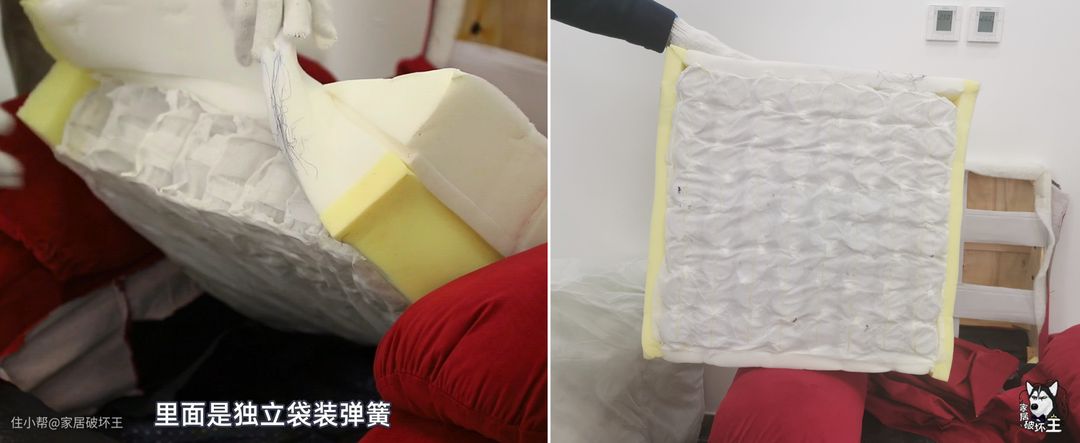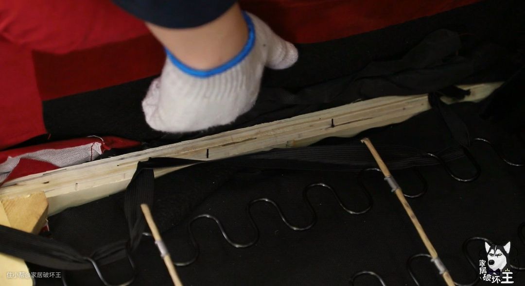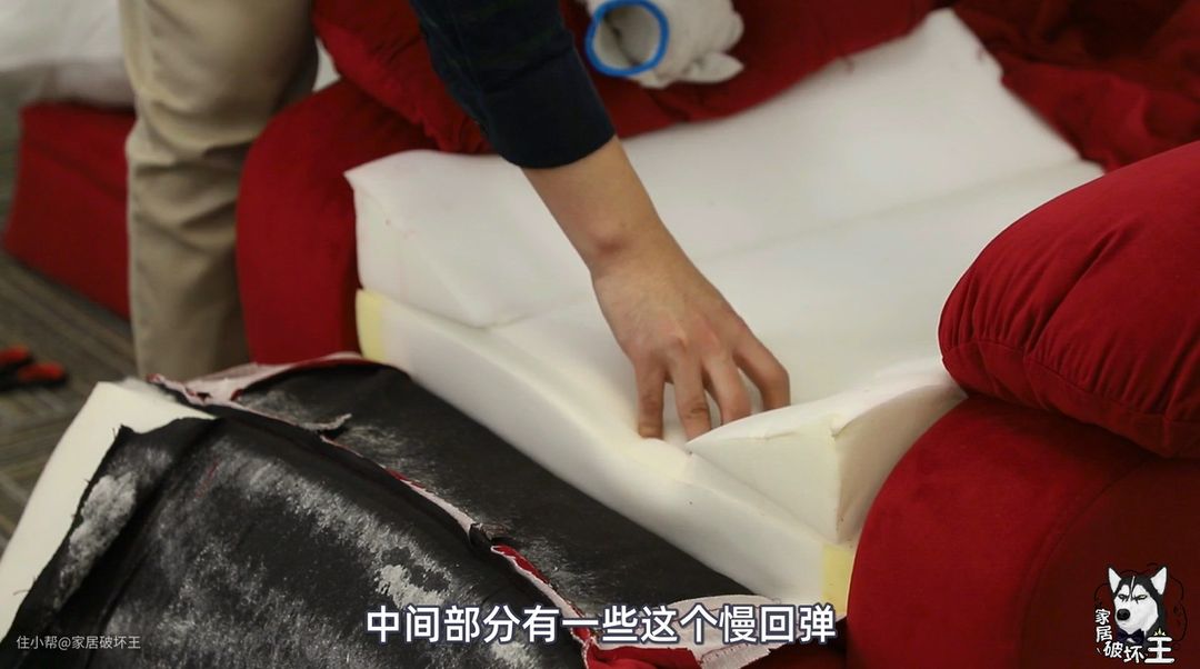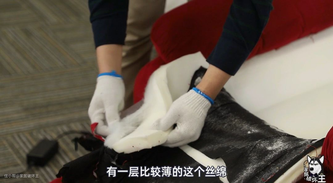 但前面我们拆过的那些品牌沙发呢,后面都是蛇形弹簧,甚至有些还会用到松紧带。它这个白色布条可以说没太大的弹性,就是起到一个支撑的作用。