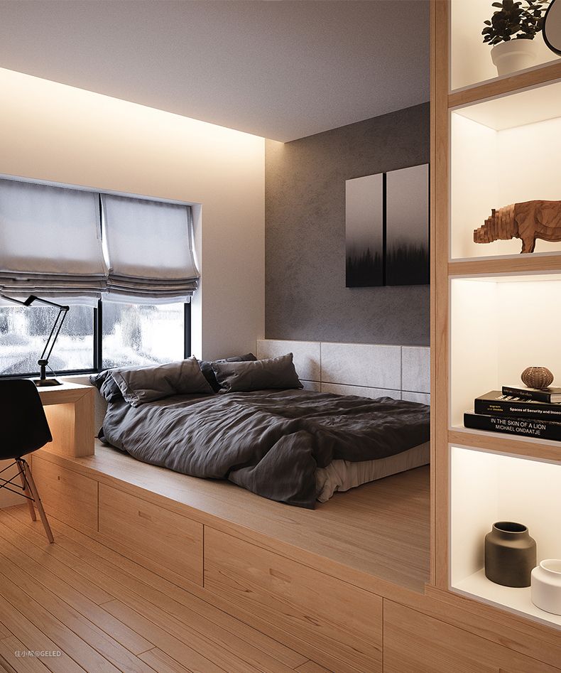内嵌的柜子是灯带的极佳发挥场所,轻松解决由于内嵌而导致的视觉盲区。