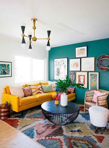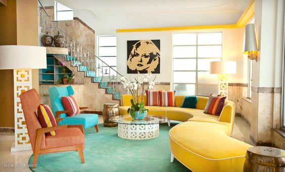 波普风的颜色都是选取一些明度很高、饱和度很高的,直白的说就是看上去特别鲜艳的颜色,比如大红色、湖蓝色、柠檬黄色,这些颜色搭配在一起,呈现出极具戏剧性的视觉效果。背景墙多用大色块拼接的方式,但是想要搭配好波普风需要十足的搭配功力,因此不如在大件的配色上遵循前面几种方案,把一些装饰品的颜色换成色彩靓丽的,比如装饰画、摆件等。