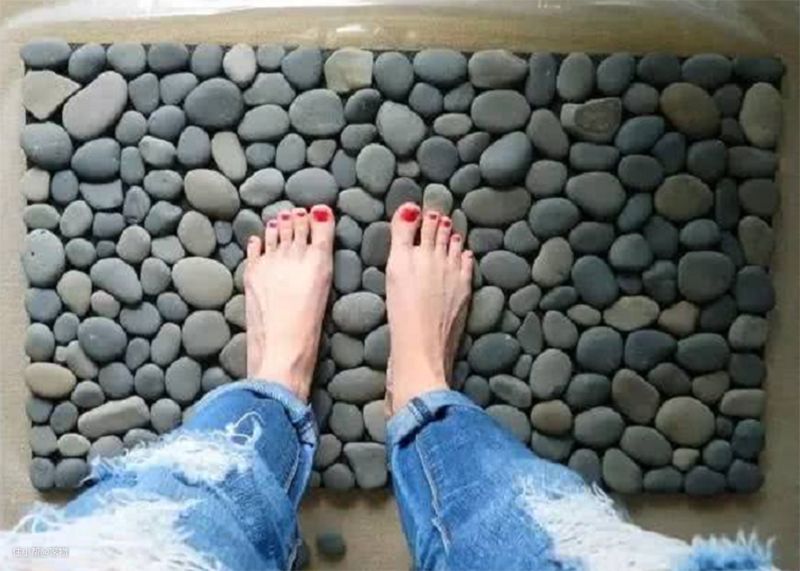 如果石头比较多,且大小差不多的话,可以做一款防滑石垫,将用旧的脚垫裁剪成合适的大小,然后用胶水将石头粘在脚垫上,不仅防滑还有足底保健的作用。