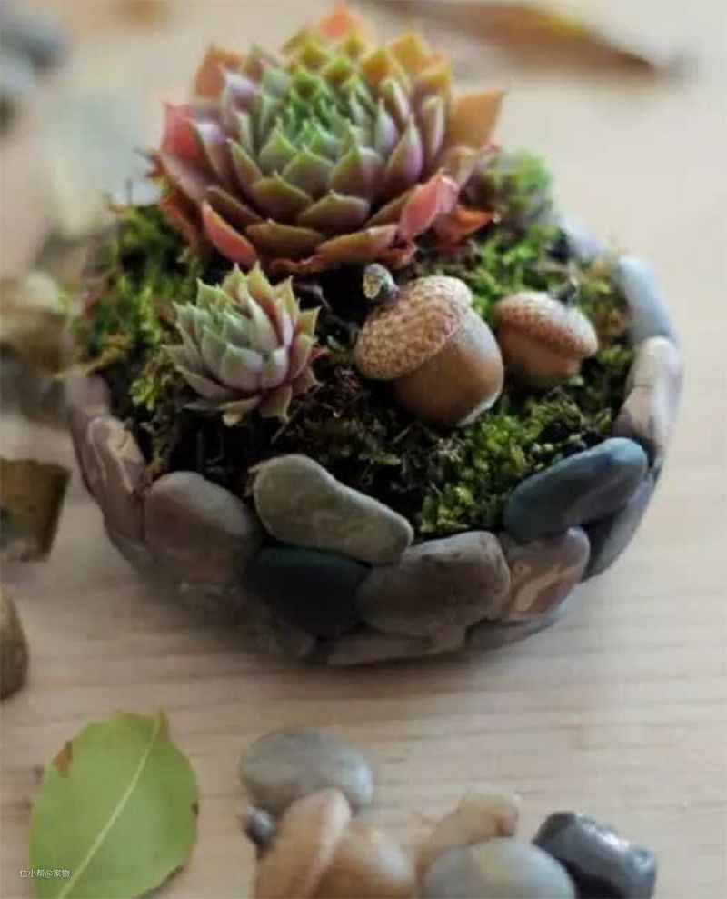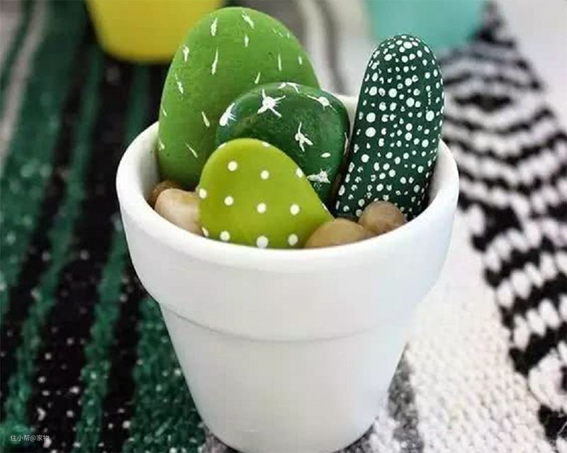 如果家里有空闲的小花盆的话,还可以用石头手动DIY一盆盆景,挑选几块形状比较扁的石头,给其涂抹上颜色,做成绿色植物的样子,将其塞到装满石头的花盆内,看上去超级逼真。