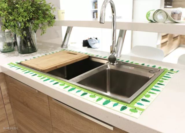 住在精装房的@赵小豆快发芽家里设计死角特别多:水池周围经常一摊一摊的水导致发霉,我买了那种吸水的台面贴,把水池四周、菜板菜刀架下面全部贴上防水,免去了每天不停擦擦擦的烦恼。