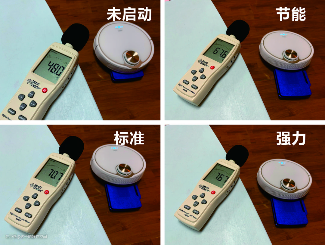 最后再来看下噪音表现。云米扫拖一体机一共有节能、标准、强力三个档位