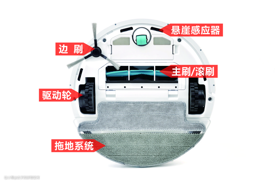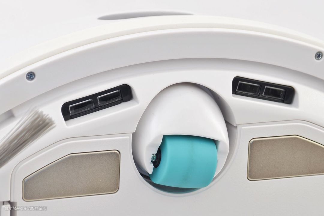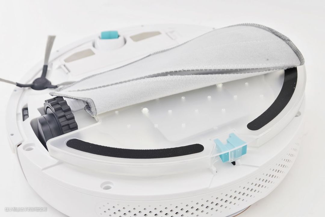 看完顶面,我们把机器人翻个面。底面视角最大的区别在于多了拖地结构。