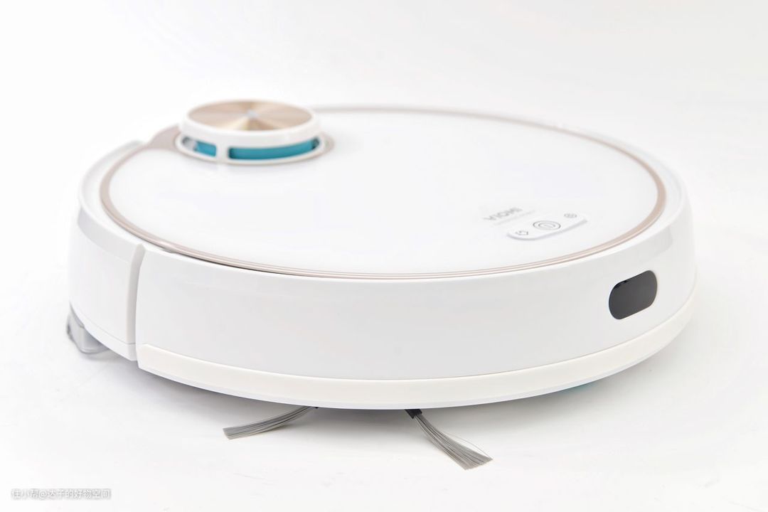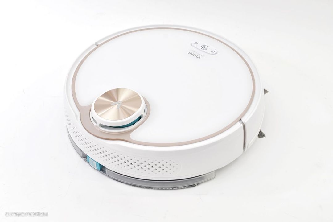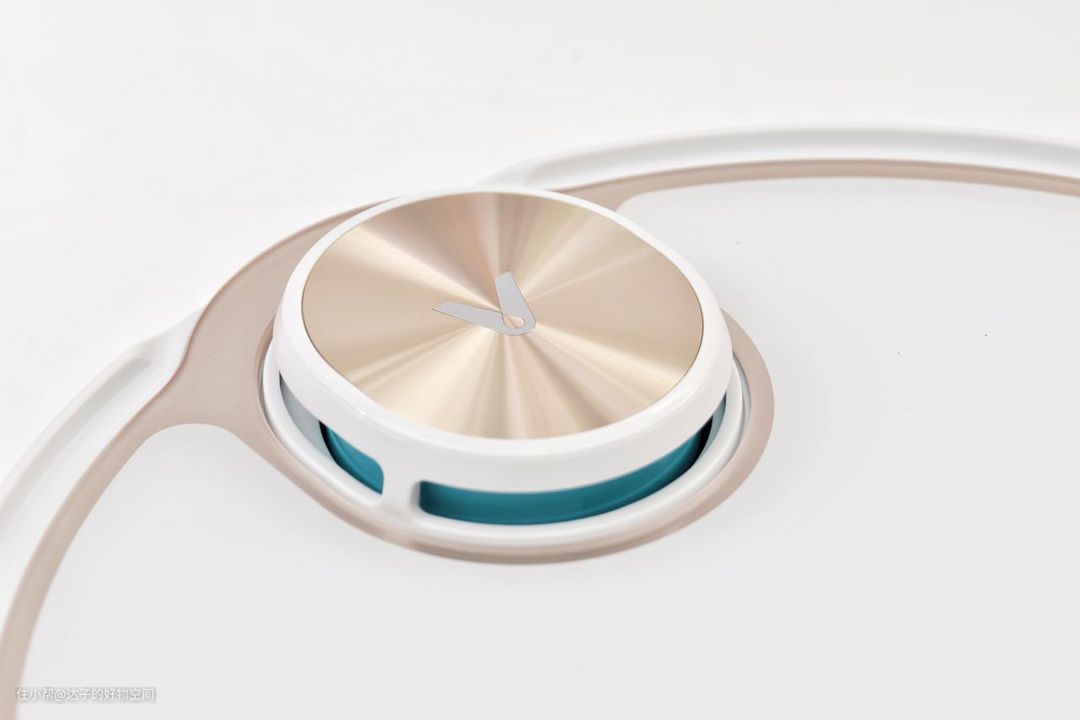 接下来看看产品吧。这次云米的这款扫拖一体机虽然是白色,但是整体看上去比较上档次。白色机身搭配类似玫瑰金的配色,看上去比较清爽。另外,顶盖应该是使用了类似IML的生产工艺,不仅好看,还不易沾染指纹等。