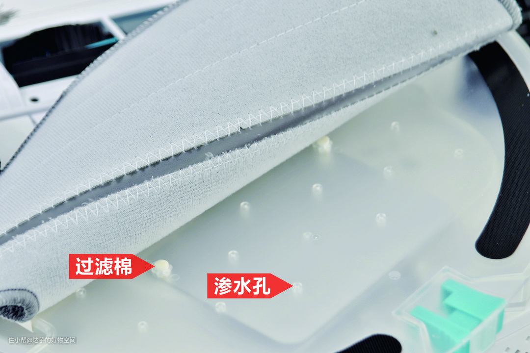 来到后面,水箱上有很多渗水孔,可以做到均匀渗水。另外还给到了过滤棉。并且云米附带了过滤棉替换件以及渗水孔疏通针,可以让拖地系统随时保持最佳状态。