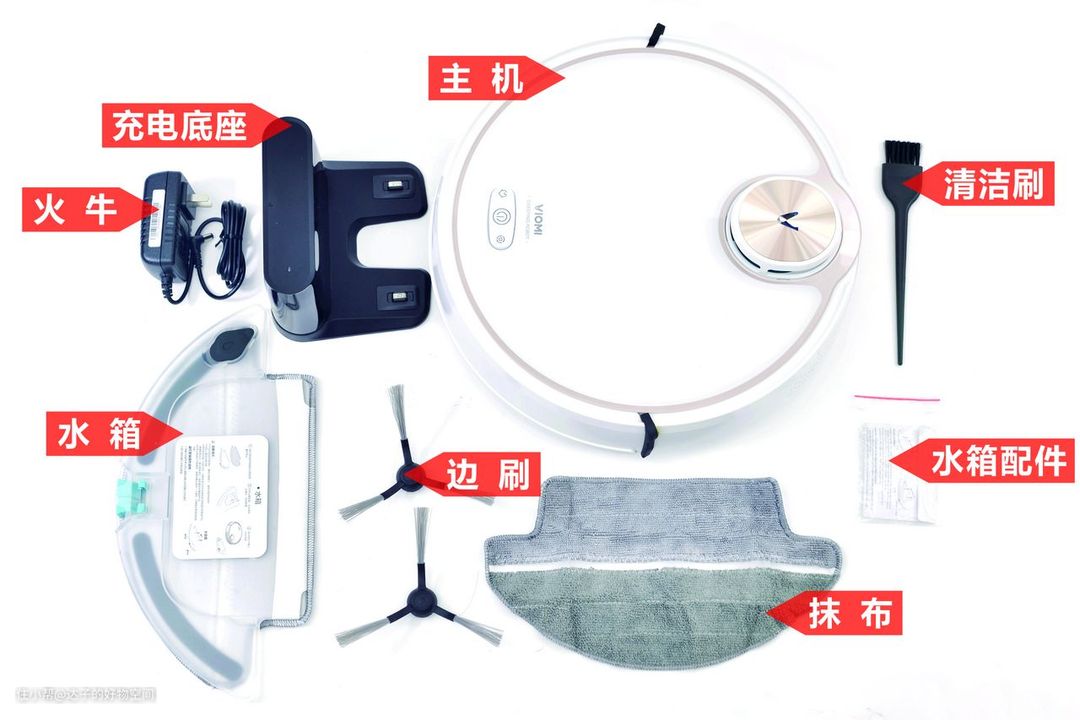 全家福如下。云米扫拖一体机出厂时并未安装边刷。厂家会在包装中额外多给到一只边刷。同时还会多赠送一张抹布以及水箱清理工具。云米扫拖一体机的清洁刷不带刀片功能,因为从厂家的描述来看,这台机器人不会缠绕头发,目前确实没有缠绕,然到底效果能坚持多久,还需要使用一段时间后再说。