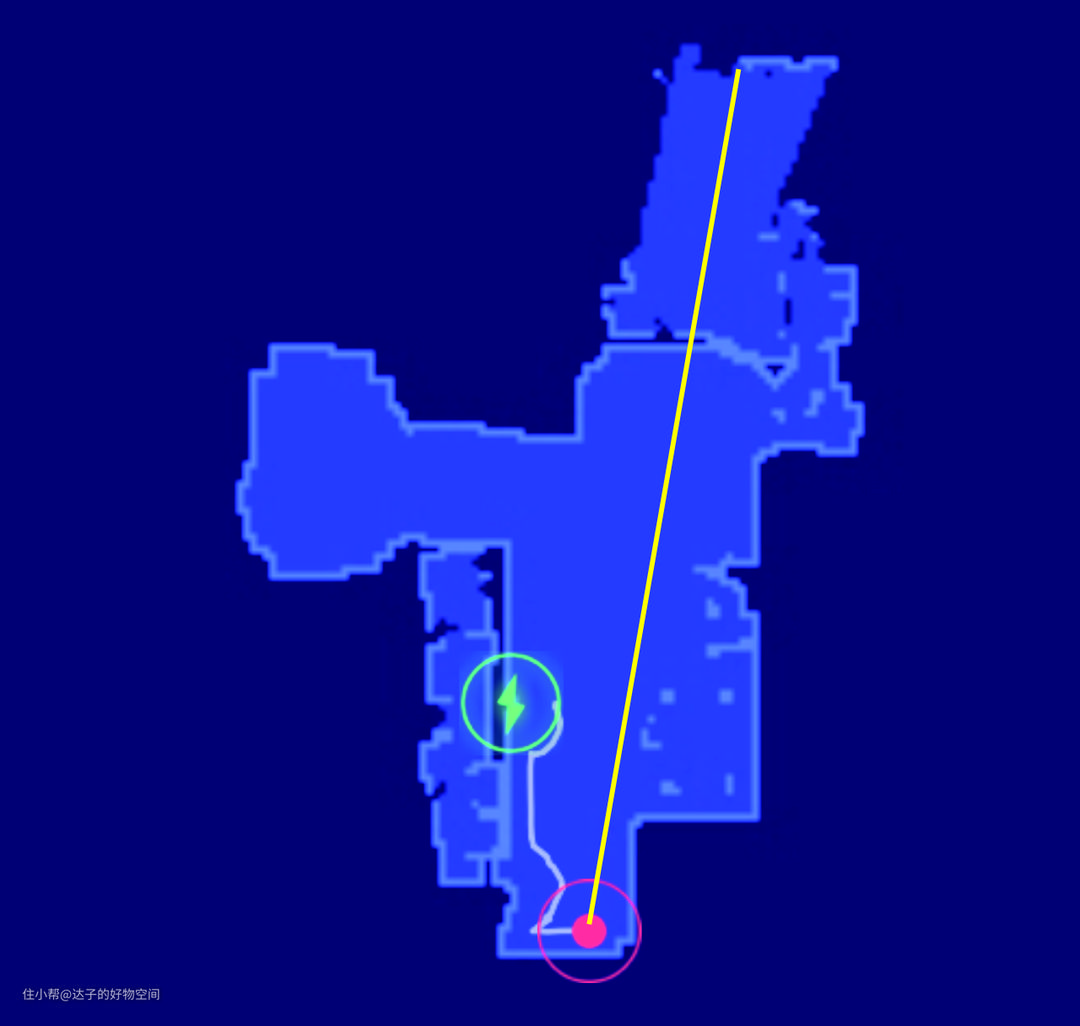 LDS的探测距离因为没有看到具体的数据,但在清扫过程中,如下图所示:当机器人走到红点的时候,它探测到了地图的最上沿位置。