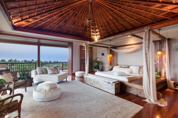 这是另一张天篷床,是带有拱形天花板的房间的亮点。虽然床本身具有极简主义的感觉,但上方的柳条天花板以及豪华,色彩丰富的环境营造出了不可否认的奢华氛围。这款顶篷床非常适合宽敞,通风的空间,其功能不只是一间卧室,还适合仍喜欢旧世界奢侈品的当代设计爱好者。