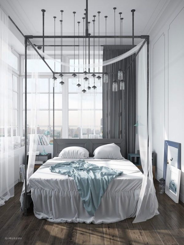 下一个天篷床更具现代感。值得注意的是,不需要巨型卧室来容纳它。当想到天蓬床时,大多数人没有我们设想的宽敞卧室。普通的家庭或公寓根本没有像小型酒店套房那样大小的卧室,因此,现代的冠层床通常被构造成适合较小的空间。此天篷床时尚,现代,可放入普通卧室。