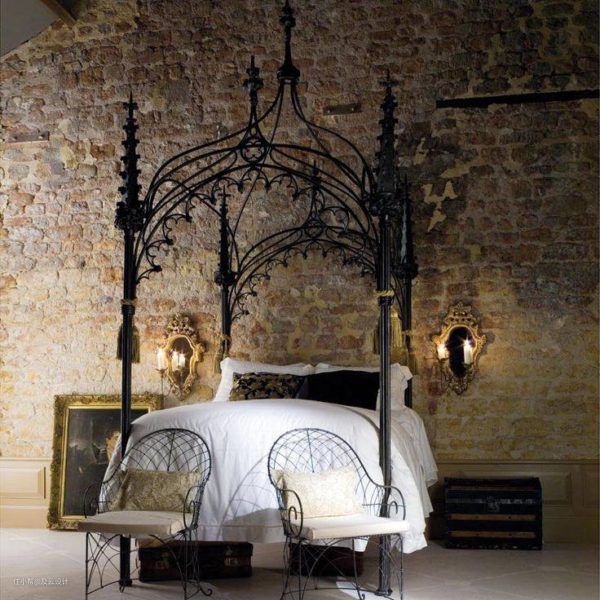 这是结合了旧世界,经典哥特式建筑和现代室内设计的天篷床。床上有一个华丽的铁架,柱子上有精美的雕刻,拱形的顶篷本身也是如此。哥特式镜面烛台和华丽的铁制装饰使外观看起来更加完美,但最吸引人的地方当然是这张漂亮的锻铁天蓬床。