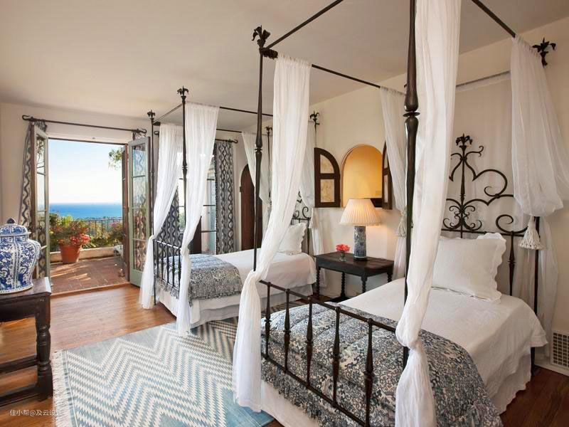 下一张天篷床可能是清单上最浪漫的床。它来自一个偏僻的意大利度假胜地,房间内有两张窗帘精美的天篷床。透过窗户的光线明亮自然,装饰简单而极简,是欧洲经典的旧世界。不可能有一个完美的度假胜地来容纳美丽的天篷床。