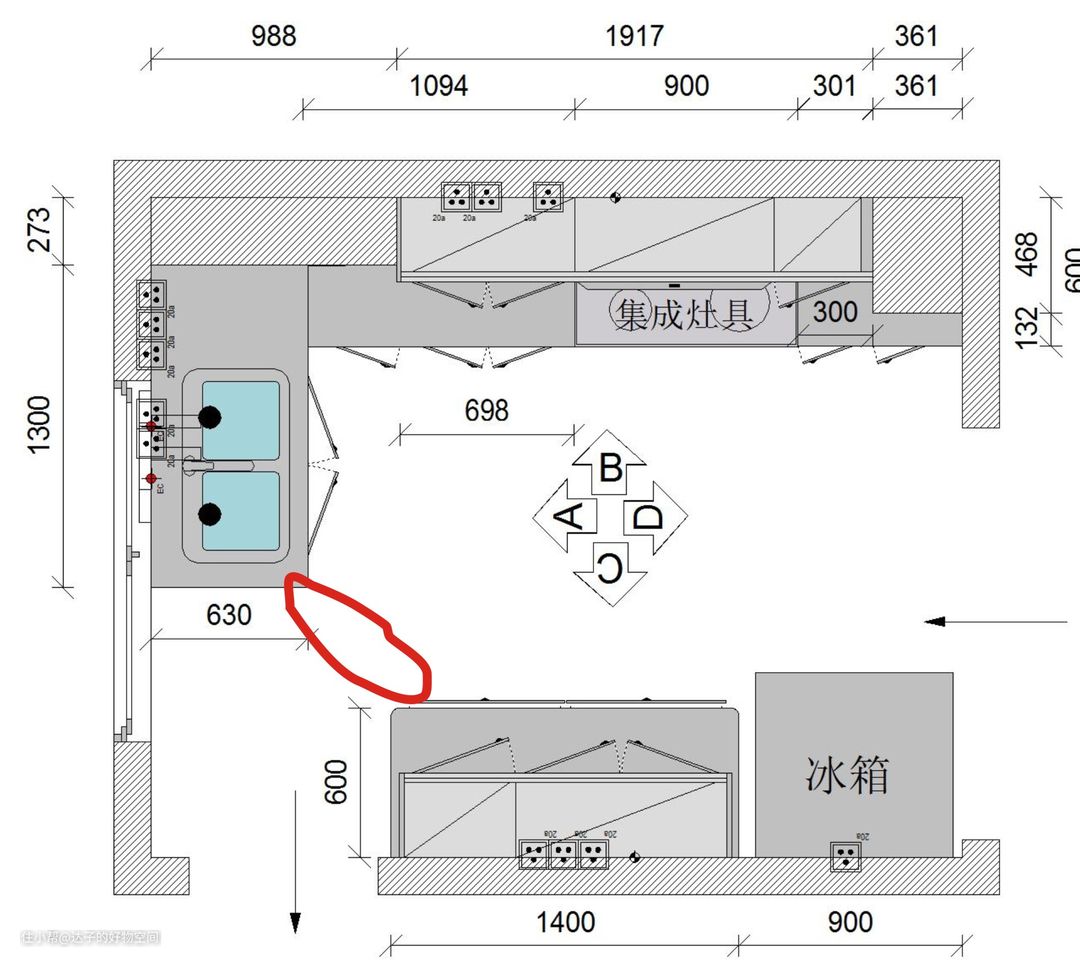 然后就发现问题了。因为厨房和生活阳台是相连的,而通往生活阳台的唯一通道就是红圈位置。这个位置的宽度由靠下的橱柜位置来决定。简单说,下面这个橱柜越往画面右侧移动,那么通往生活阳台的通道宽度就越宽。