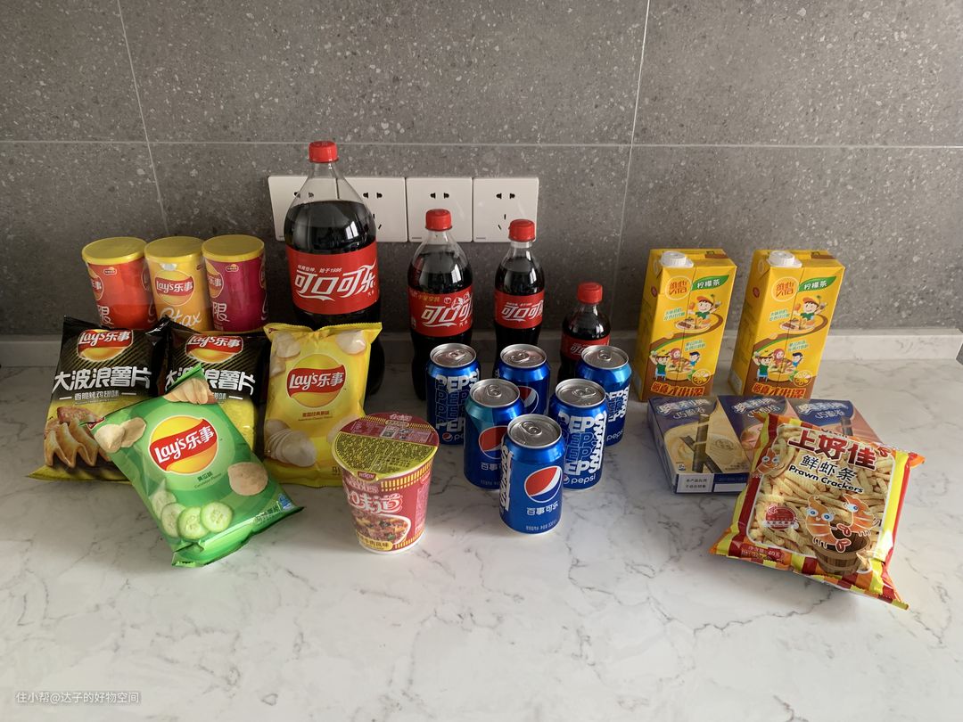 外观简单看看之后,我们来看下作为一台冰箱最基本的能力---储物能力。为了能更直观的为大家演示525的储物能力,我专门去超市买了一些常见的零食和饮料,比如下面这些