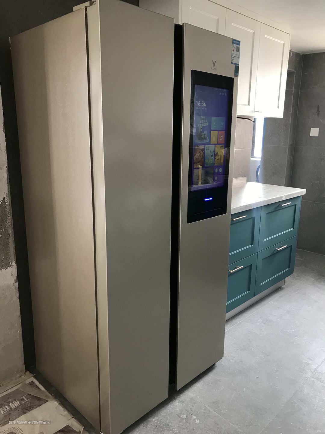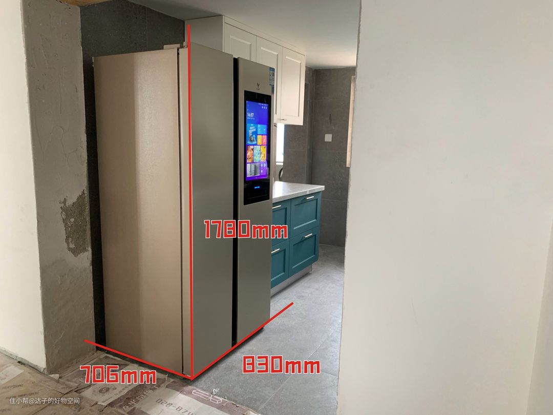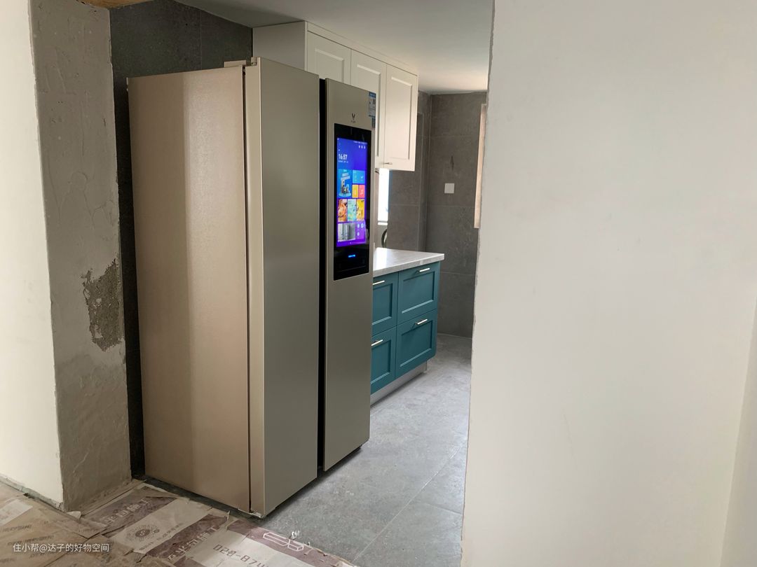但我们想要的对开门形式的冰箱宽度一般都不小。虽然也有70厘米左右宽度的,但对于对开门而言,太小气了。根据平面图推测以及脑补,我们最终将冰箱位的宽度预留在90厘米。并且为了开关门方便,实际冰箱的宽度在85厘米以内是最好的。