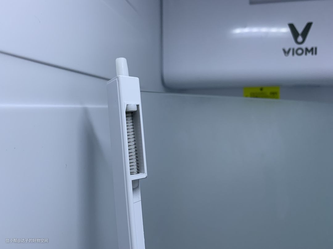 每个区域的隔板是可以拆卸和自定义安装的。和一般的冰箱不同的是,云米这款冰箱的隔板使用了锁扣的方式,需要松开锁扣接头后才能拿出隔板,一定程度的避免隔板被误操作滑出来。