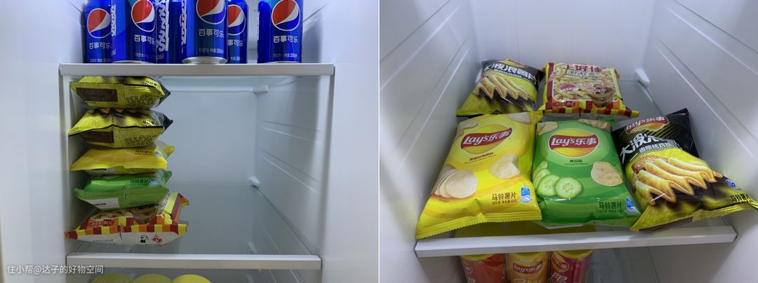 如此算下来,以我调整的层高为例,单层一共可以放30包最小规格的薯片。按照一包薯片5.9元的单价,放满一层需要177元。而冷藏室除开门板外,则需要180包薯片花接近1062元才能塞满!