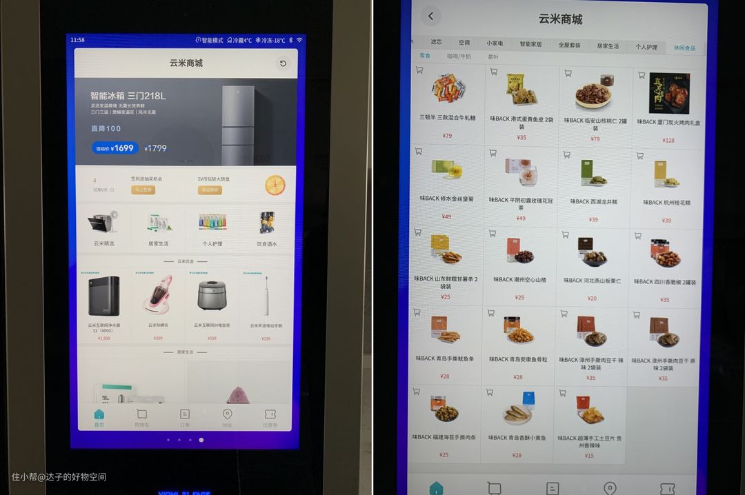 云米在这块大pad中内置了在线商城。用户不仅可以采买电器生活用品外,还可以采购零食、食材等。