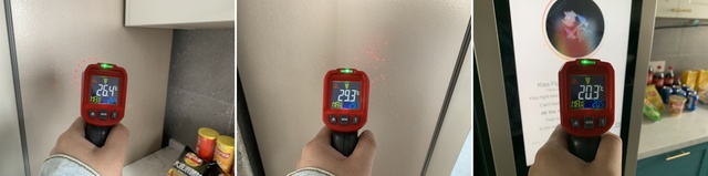 对525的体验还在继续中。实际测试的时候发现冰箱并没有太大噪音,即便是启动强力制冷后,噪音几乎忽略不计。冰箱周围的发热也不算明显,实测温度如下图。我想,云米的平板应该是世界上最不用担心温度过高的平板产品了吧,23333~~~