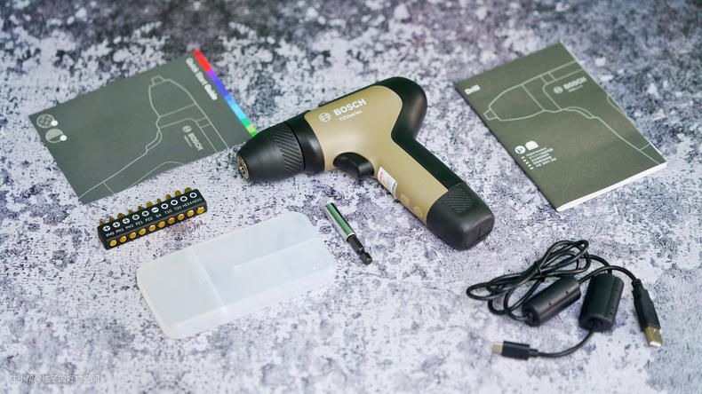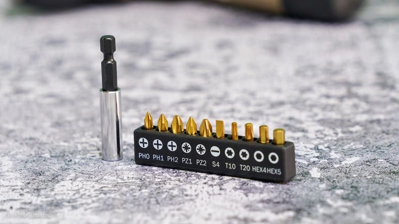 外观方面最后再来看下配置的批头。博世为小金钻配置了德国博世原装金色批头。精度和高度更高,不易出现滑丝磨坏的情况。批头中除了常见的十字(梅花)和一字(平口)造型外,还配置了内六角批头。