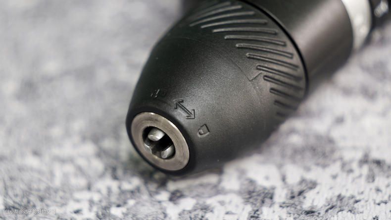 小金钻的夹头收紧和放开的方式延续了传统方式,通过左右拧的方式实现。在夹头上有提示松紧的方向。