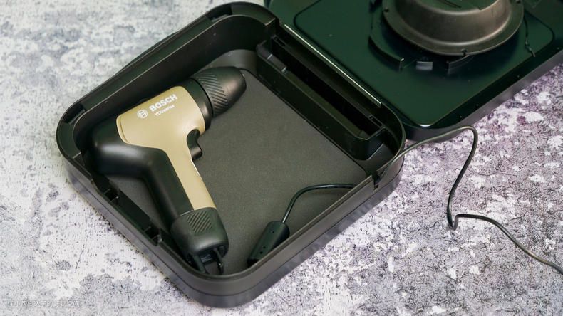 打开之后里面非常简单,一把电钻,一套批头以及充电线。包装里面设计了一个很有意思的东西---盖子上有个软胶材质的博世LOGO,即可作为绕线器收纳充电线,还可以作为限位器,在关闭盒子的时候固定小金钻。