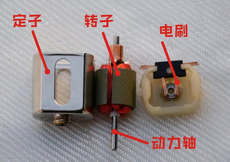 电刷与转子接触后形成回路,转子交换器上的绕线在通电情况下产生电磁场,这个磁场与定子上的永磁磁钢产生排斥/吸引作用,从而使得转子开始旋转。这是电动马达最简单的一种动力结构设计。