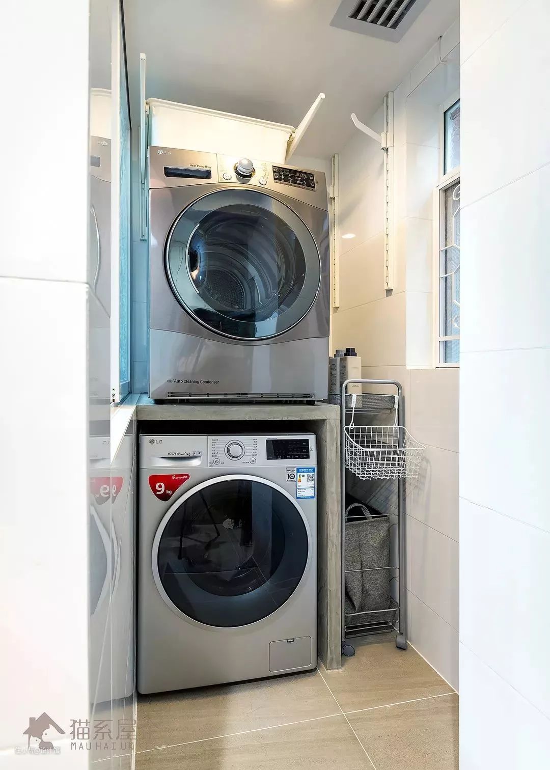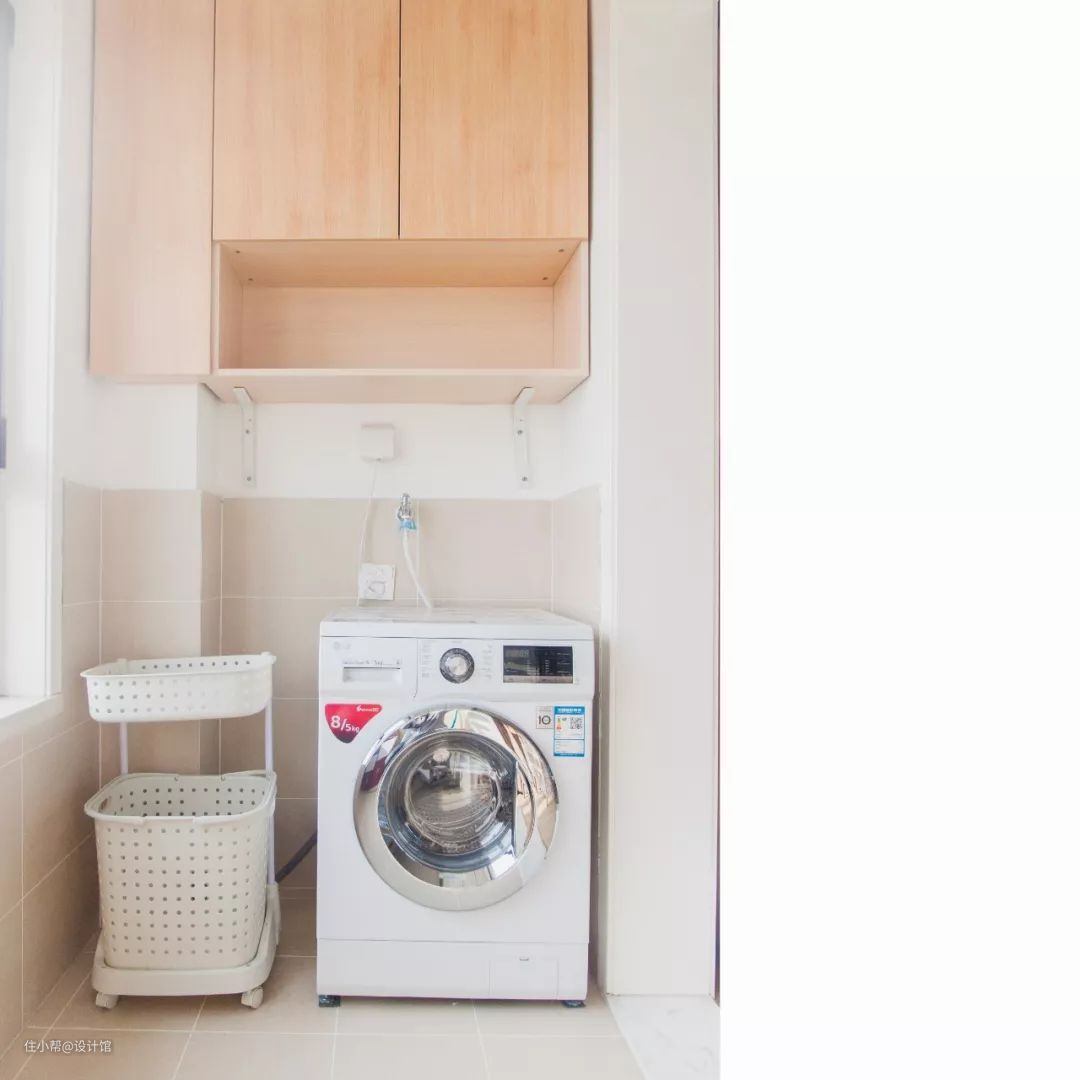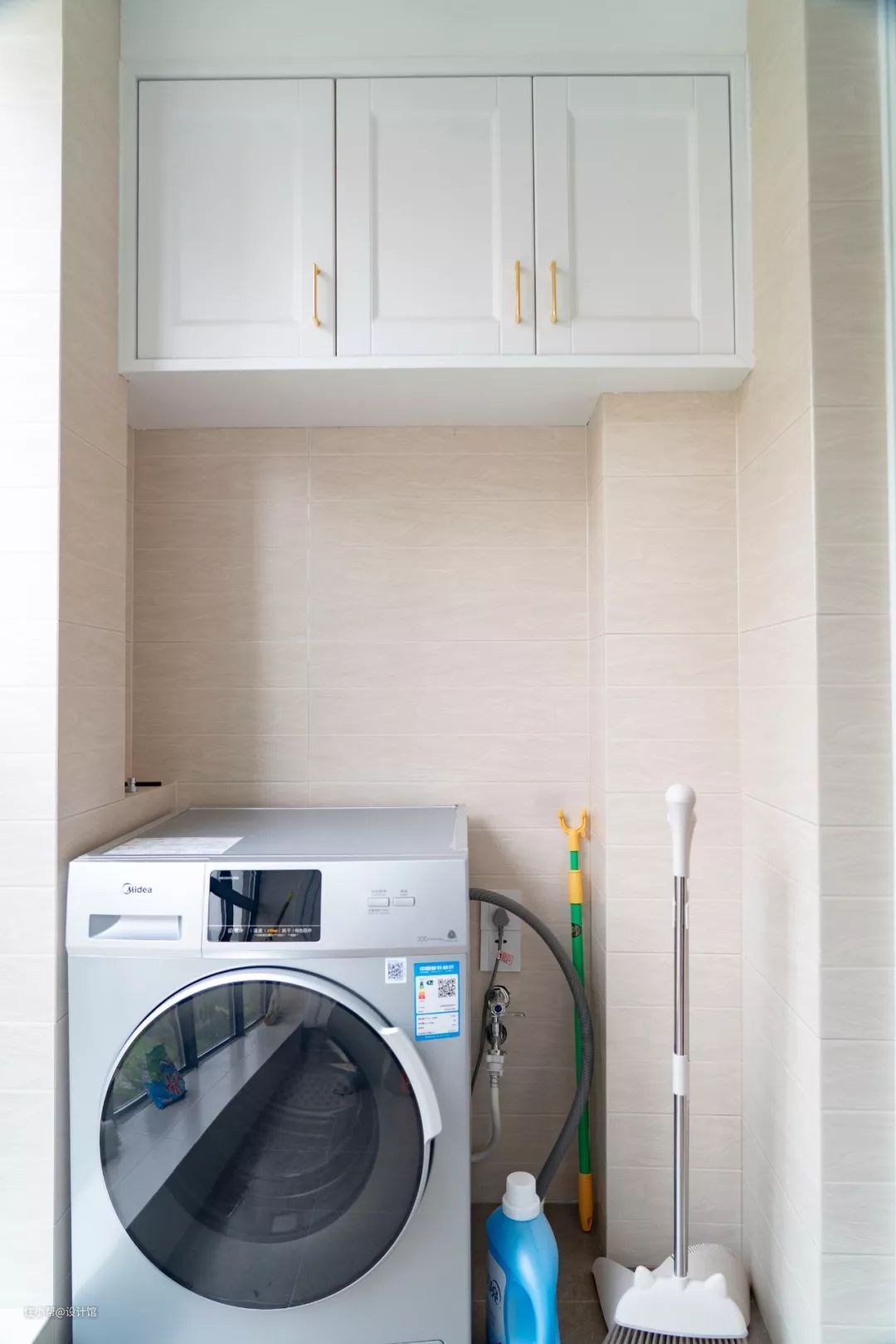 通过定制柜的设计,根据洗衣机的尺寸预留好洗衣机的摆放位置,而且定制柜还可以把洗衣机上方的空间也利用起来,装上一个通顶的收纳柜,提供更加充足的杂物存放空间,实现空间利用最大化。