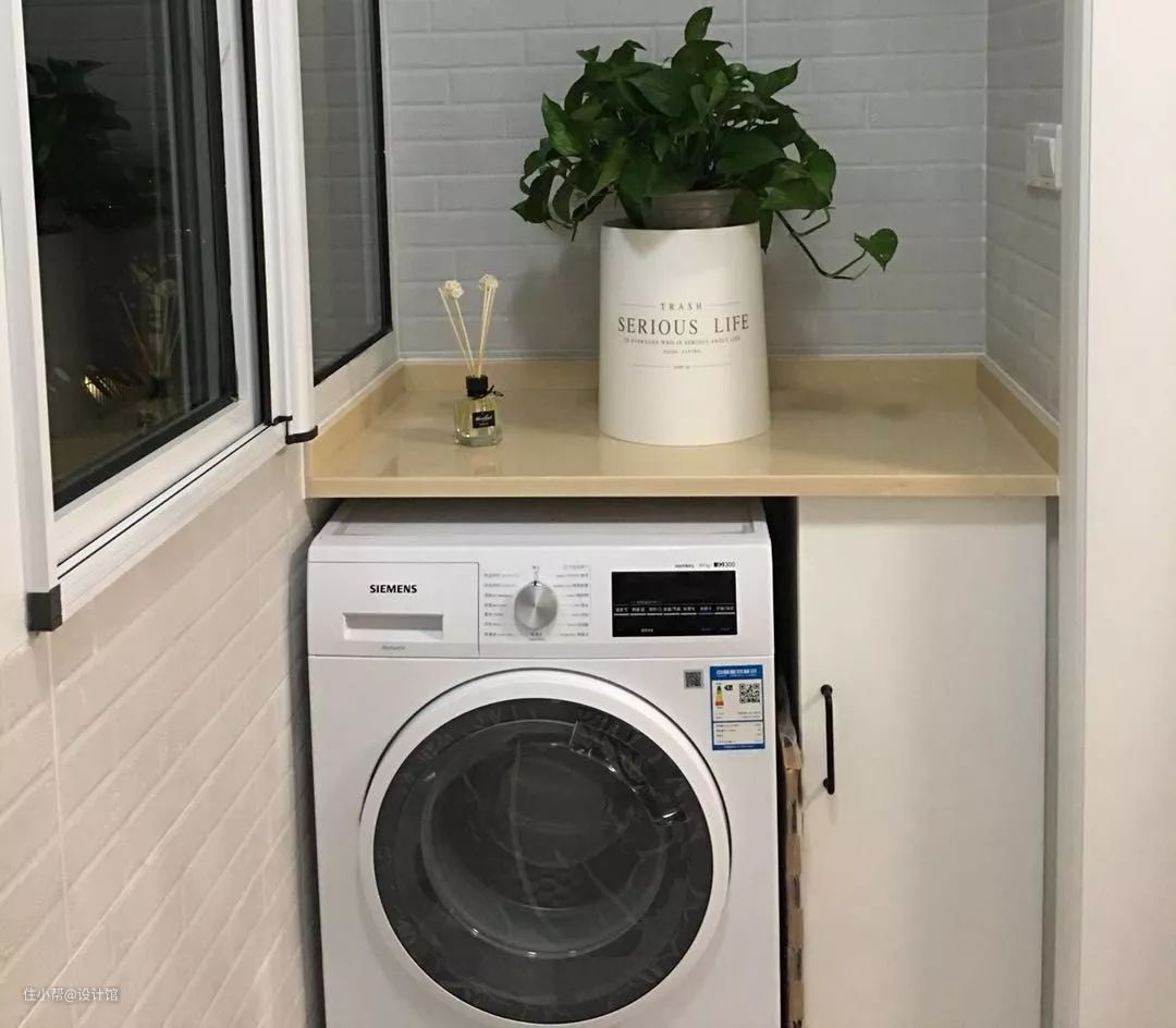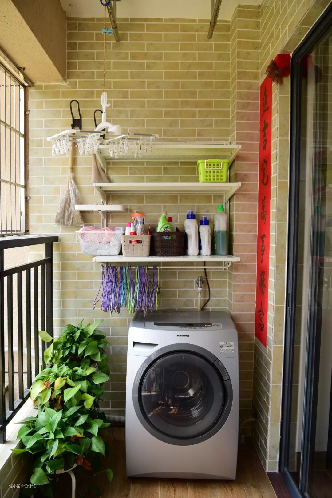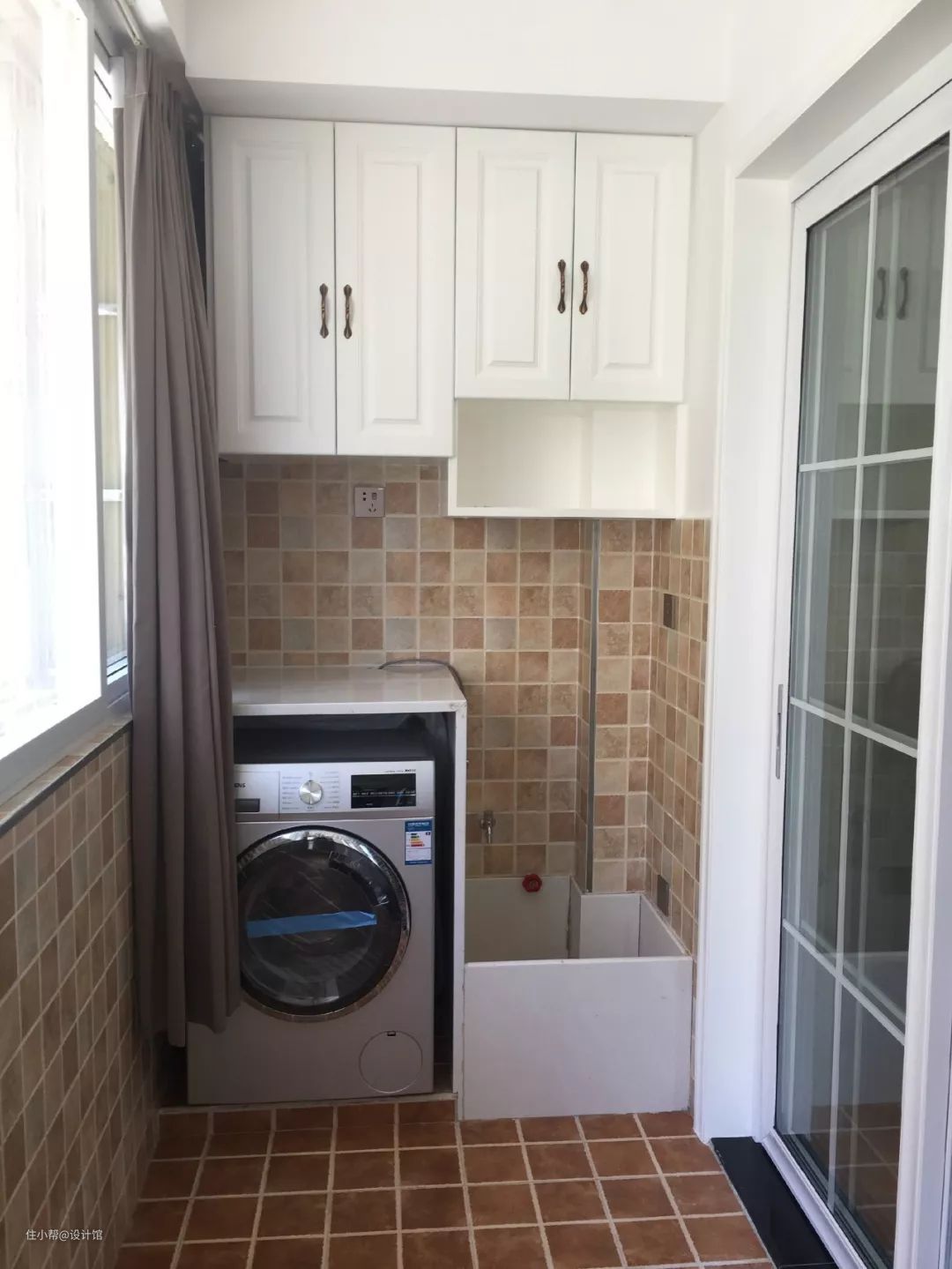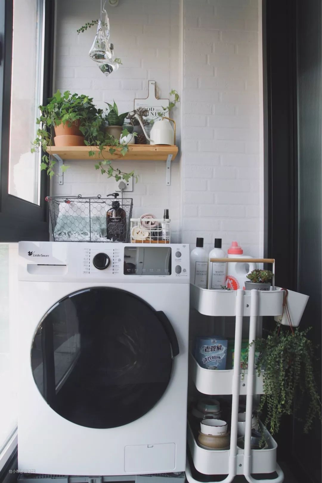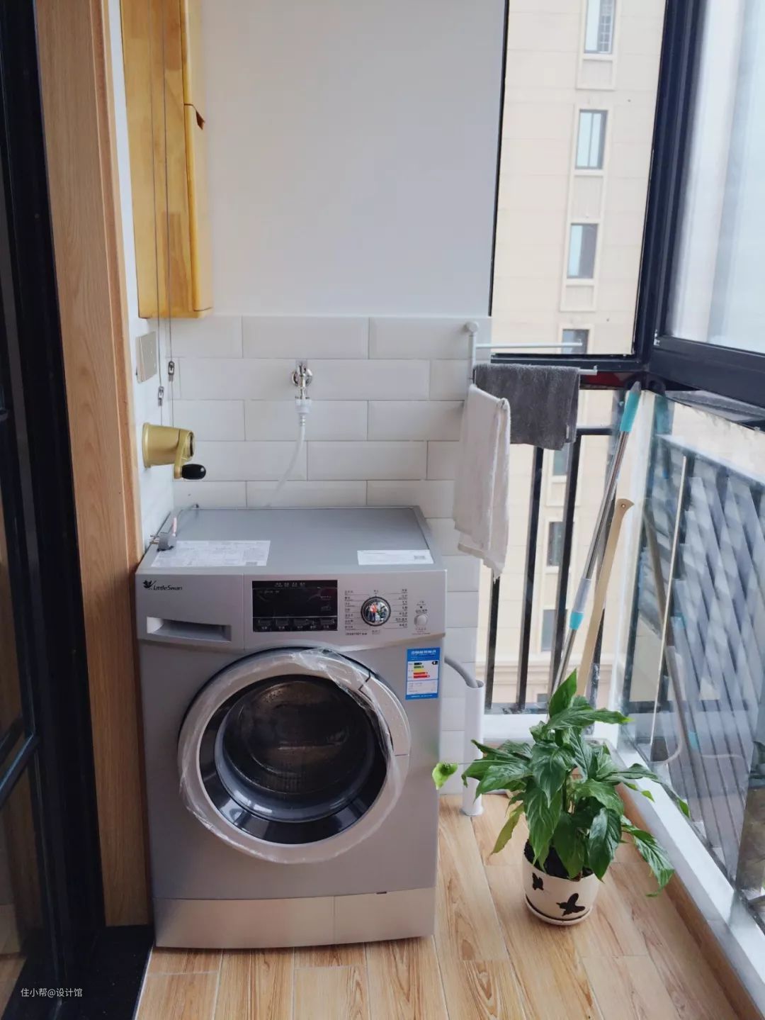 在于空间是极度紧凑的、刚好只够摆下洗衣机的情况,建议这种小阳台在选择洗衣机的时候就要看好洗衣机的尺寸,避免买了洗衣机太大摆不下的尴尬。而这种阳台洗衣机旁的空位,通常无法利用就可以留空通风,让洗衣机保持干燥了。