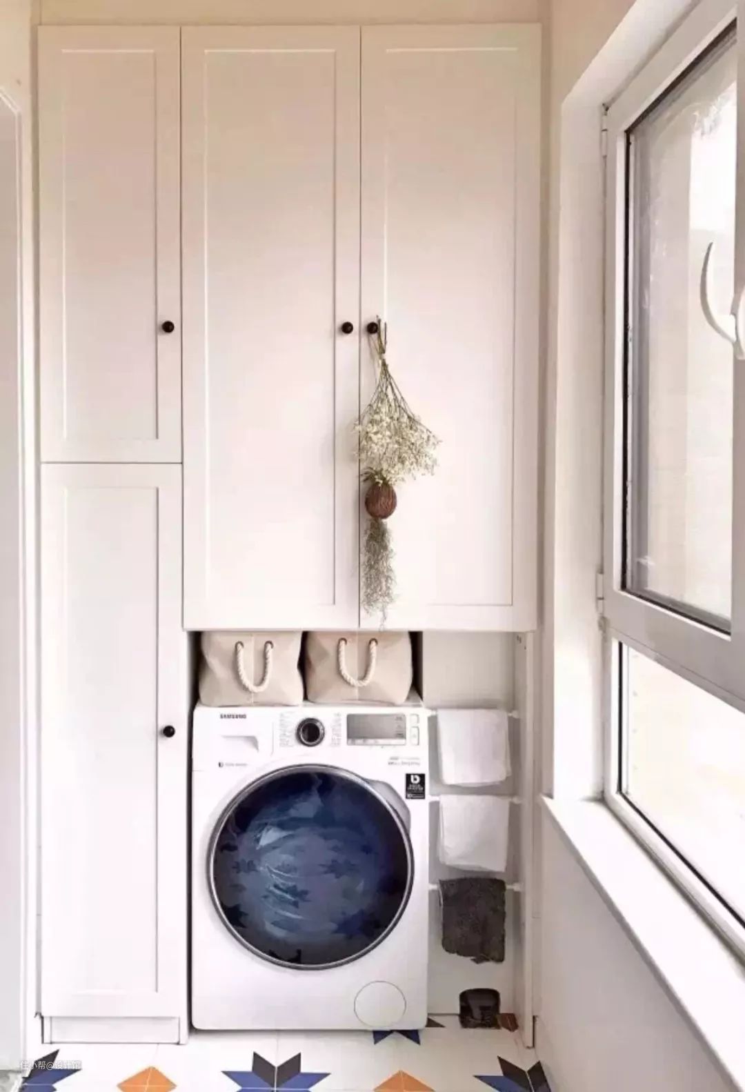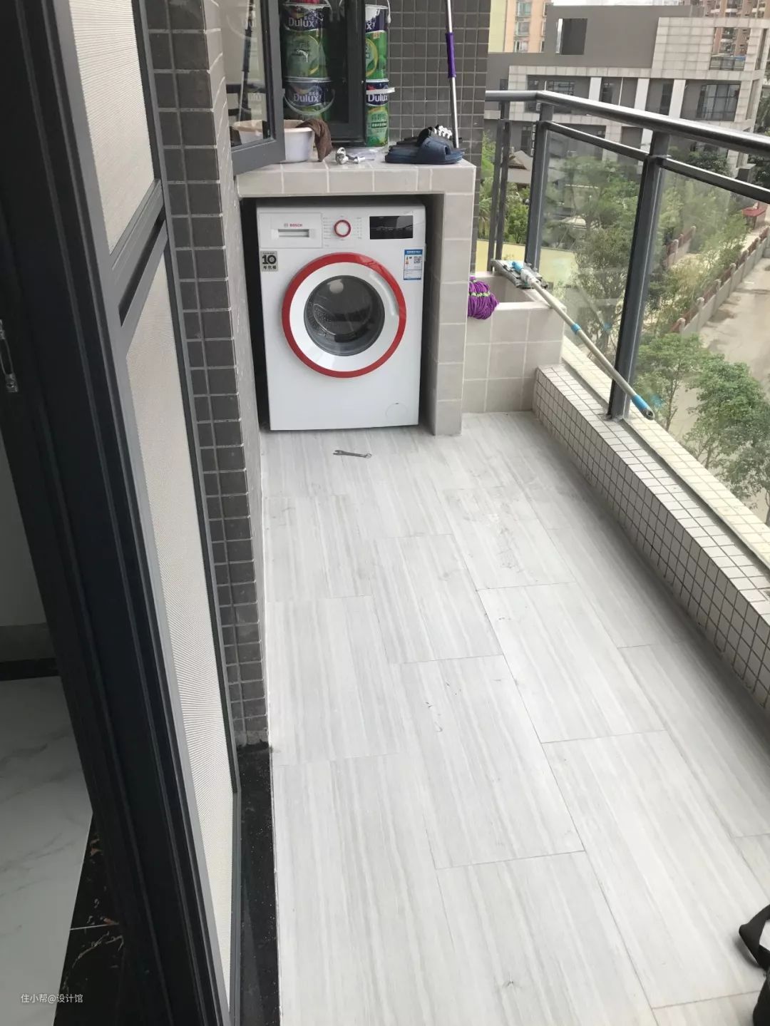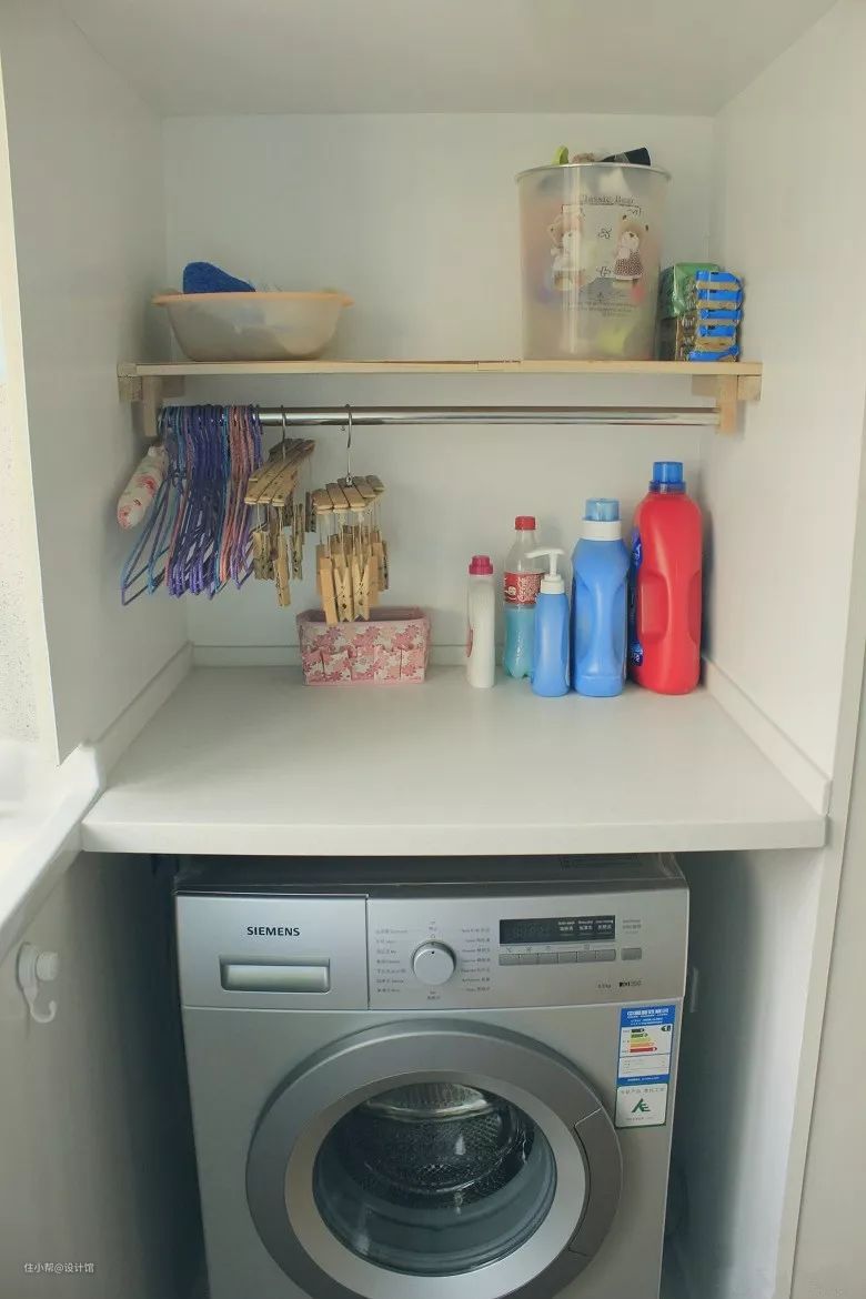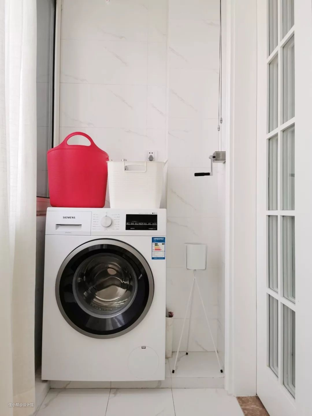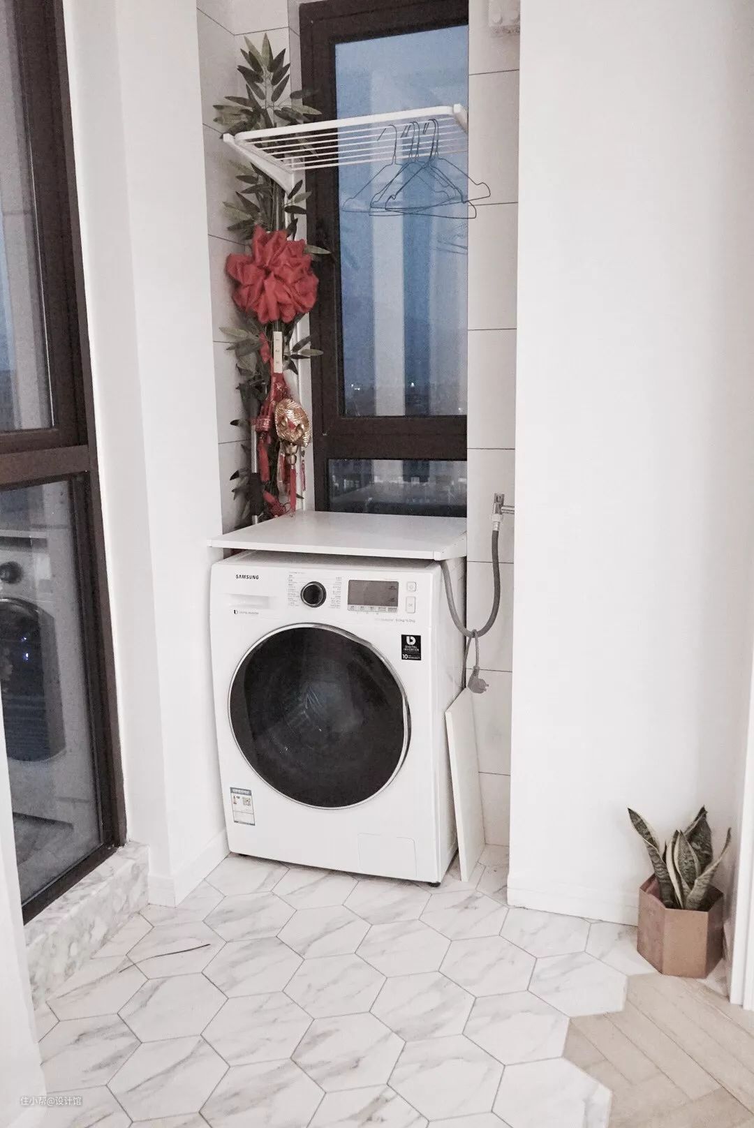 在于空间是极度紧凑的、刚好只够摆下洗衣机的情况,建议这种小阳台在选择洗衣机的时候就要看好洗衣机的尺寸,避免买了洗衣机太大摆不下的尴尬。而这种阳台洗衣机旁的空位,通常无法利用就可以留空通风,让洗衣机保持干燥了。