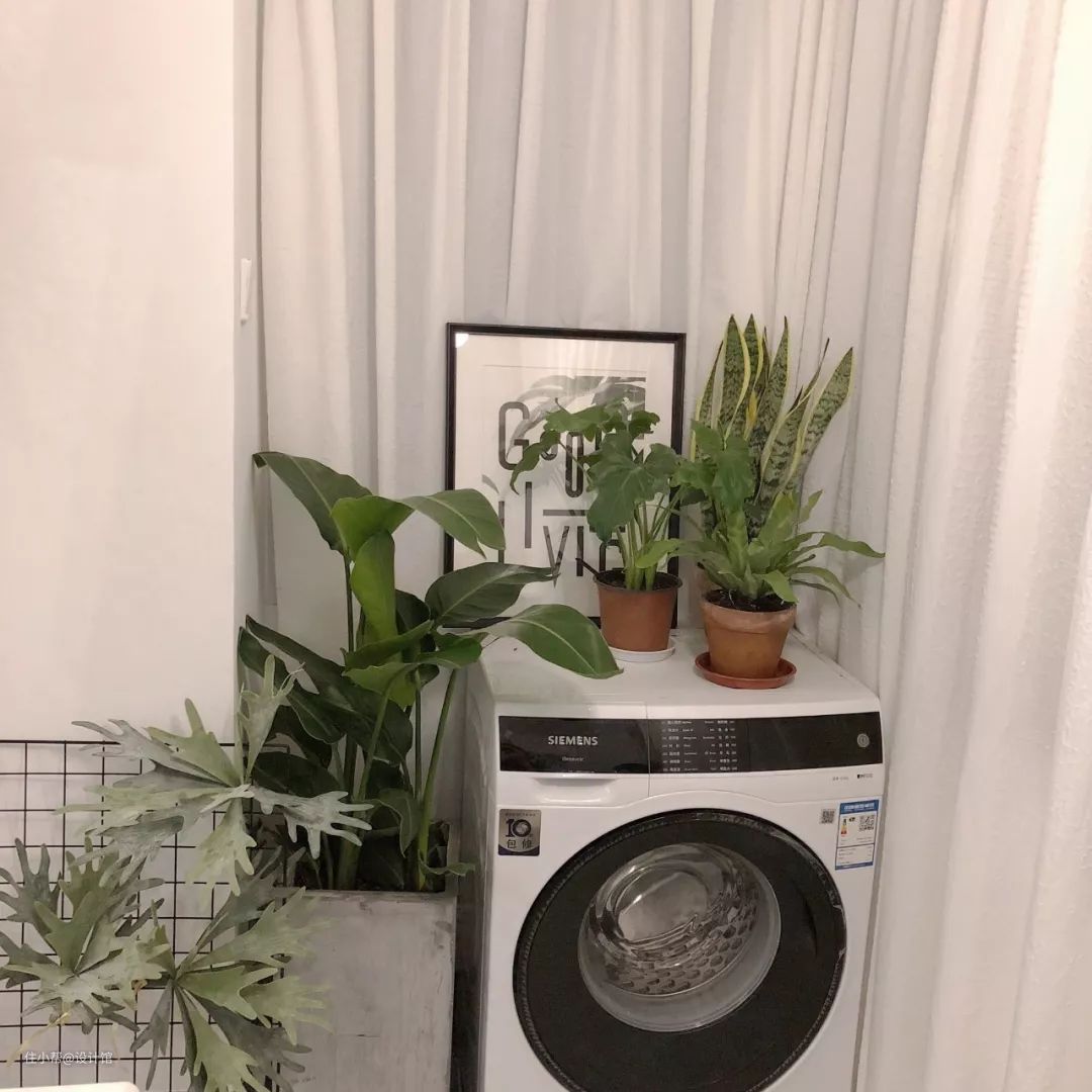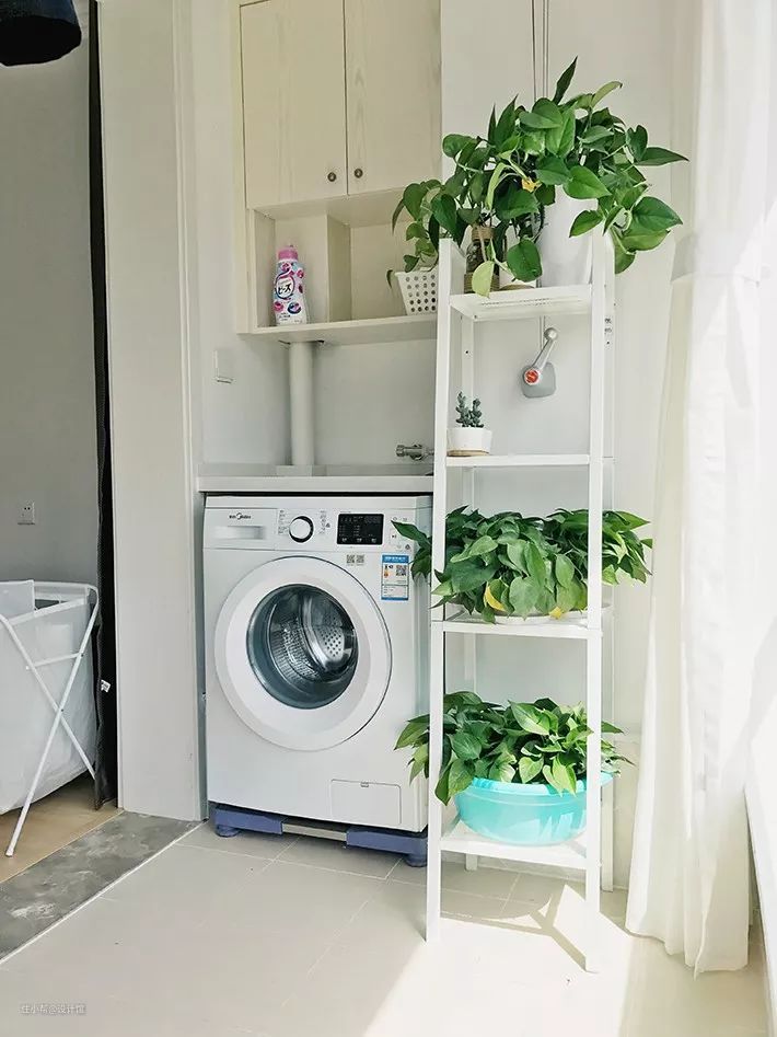 摆下洗衣机后,旁边还多了一点位置,留空觉得浪费太可惜,那么可以在这个空位摆上一盆绿植,这样也是非常美观精致的设计,可以让阳台氛围显得更加清新自然舒适。