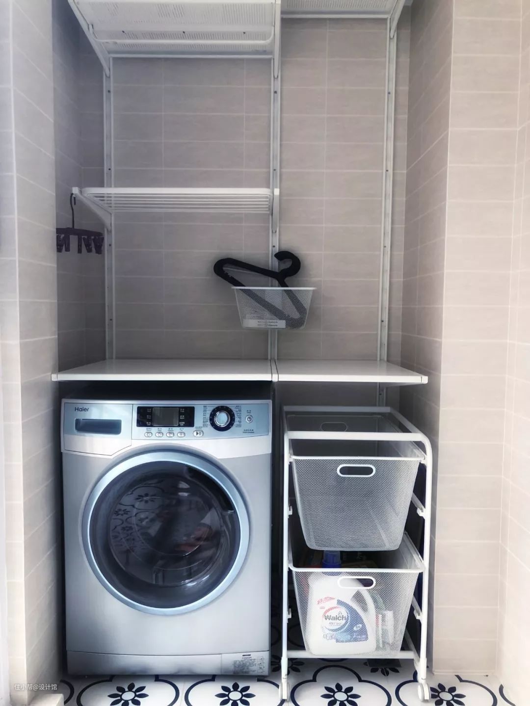 对于宽度位置比较小的阳台,放下洗衣机后留出的位置就没多少剩余的了,这个时候可以在这个空位上摆一个便携式的收纳架,用于存放洗衣液、衣架、夹子等小物品,也可以放置换下待洗的衣物,让小空间的利用最大化。