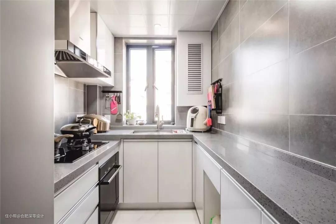 L形厨房的话,我们可以选择在拐角做高低台的过渡,这样就可以轻松将炒菜与水槽区分离出来。将水槽区和操作台放同一个台面,也符合人在厨房的生活动线,洗菜切菜更方便省事,不用来回走动折腾。