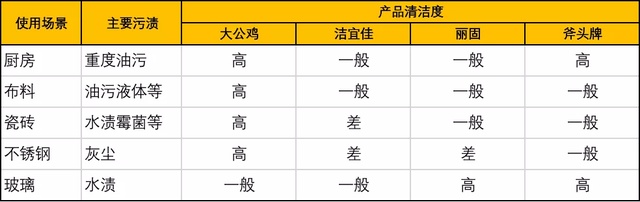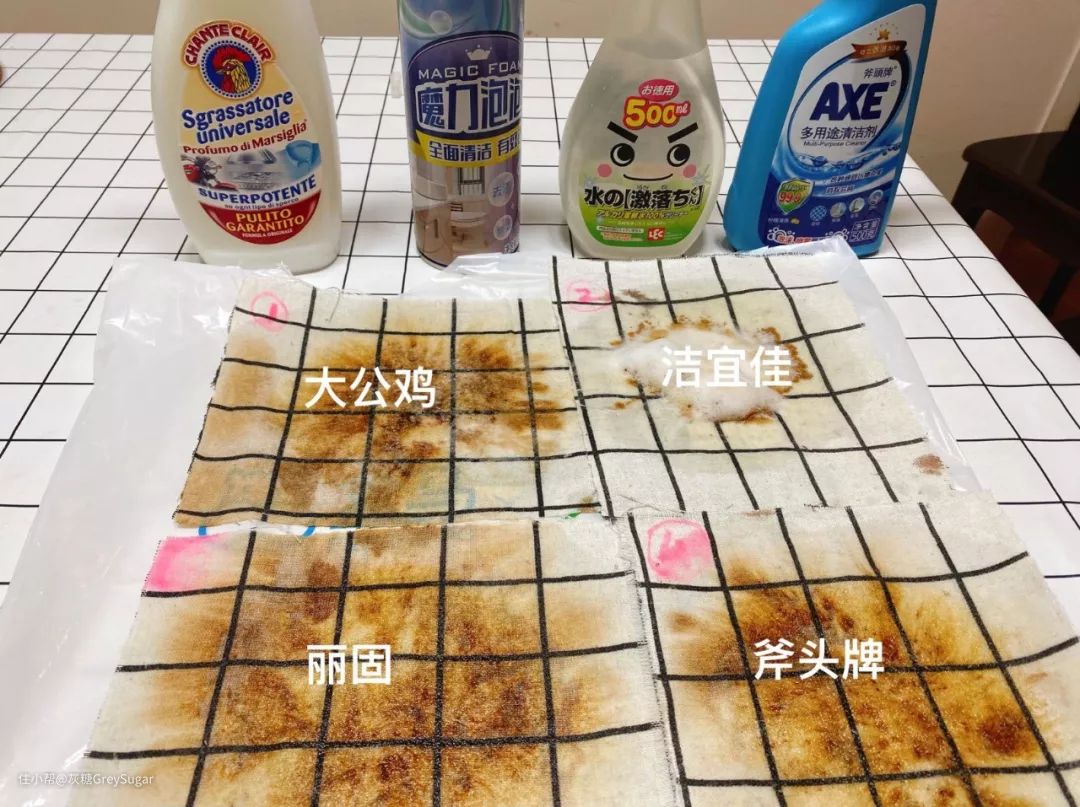 这一次表现最优秀的是丽固和斧头,大公鸡会有少许残留。而洁宜佳表现稍逊。