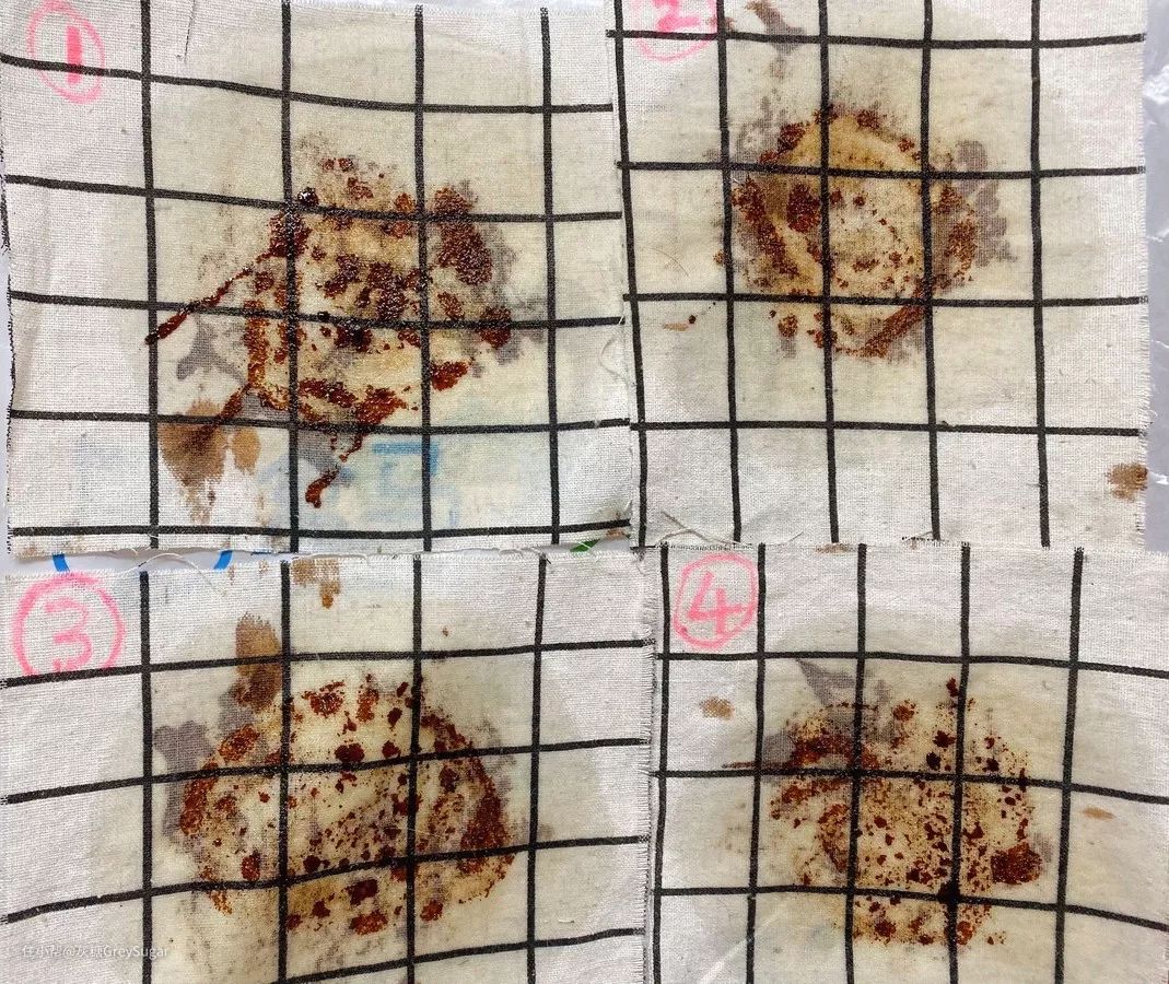 这一轮,真是完成了儿时搞破坏的梦想~在四块桌布上,抹上等量的菜籽油、老抽,魔性混合。模拟桌布被浸入油渍、饮料等的状态。1~4号分别是大公鸡、洁宜佳、丽固和斧头牌。