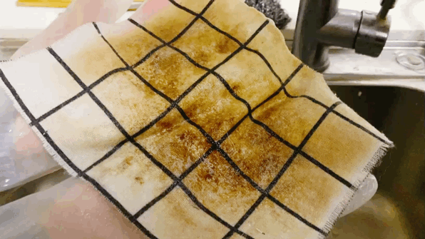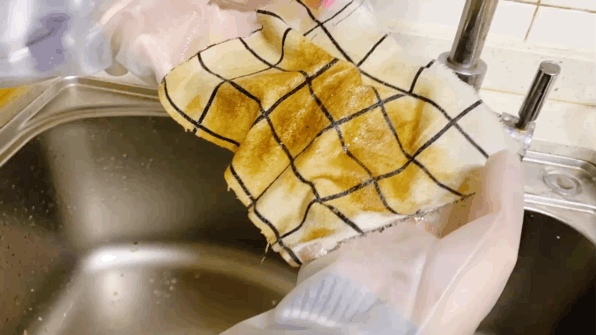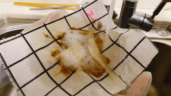 静置后,把4块桌布依次拿到水龙头下冲洗相同时间(不揉搓)。