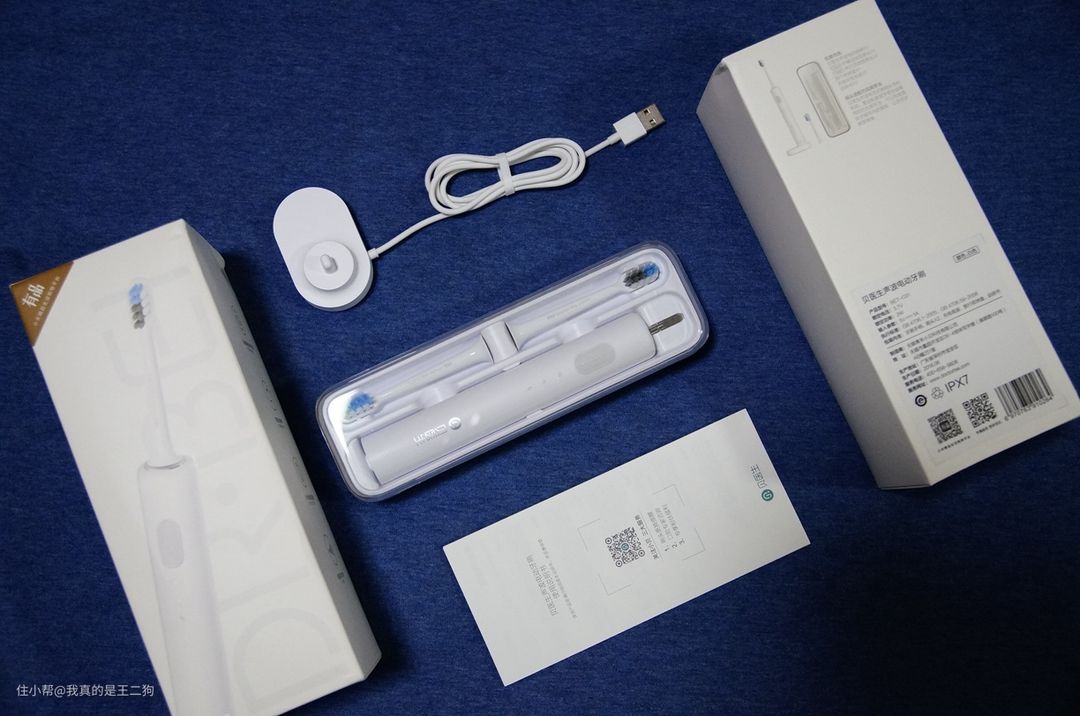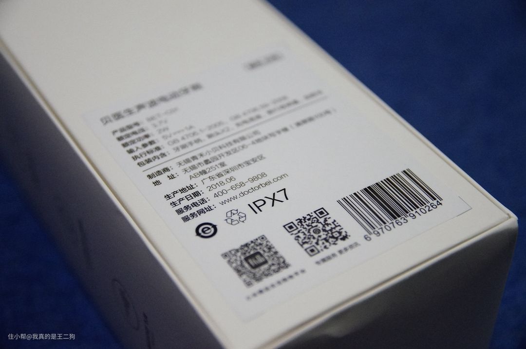 侧面有一些贝医生电动牙刷重要参数介绍,支持IPX7等级防水,支持两种刷头,同时支持无线充电。这些功能和手上的飞利浦热门型号6730基本一致,应该算是现在电动牙刷的标准配置。