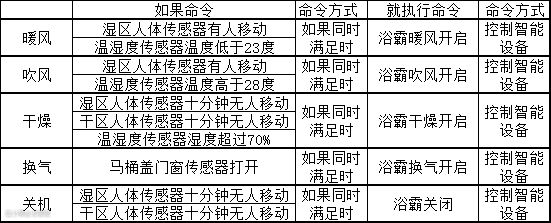 1、当浴室人体传感器感应到有人移动,同时温湿度传感器感应到温度低于23度就开启暖风,高于28度开吹风,10分钟内都没感应到人移动自动关闭暖风。