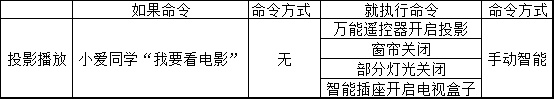 对智能音响说出“我要看电影”,万能遥控器开启投影,米家智能插座打开电视盒子,B1智能窗帘关闭窗帘,aqara开关关闭全屋除洗手间和阳台灯光以外的灯光。