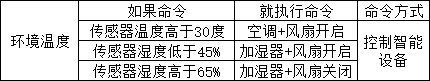 当判定有人回家同时温湿度传感器检测到温度高于30度则打开风管机,湿度低于45%则打开智米纯净型加湿器,湿度高于65%时加湿器自动关闭。