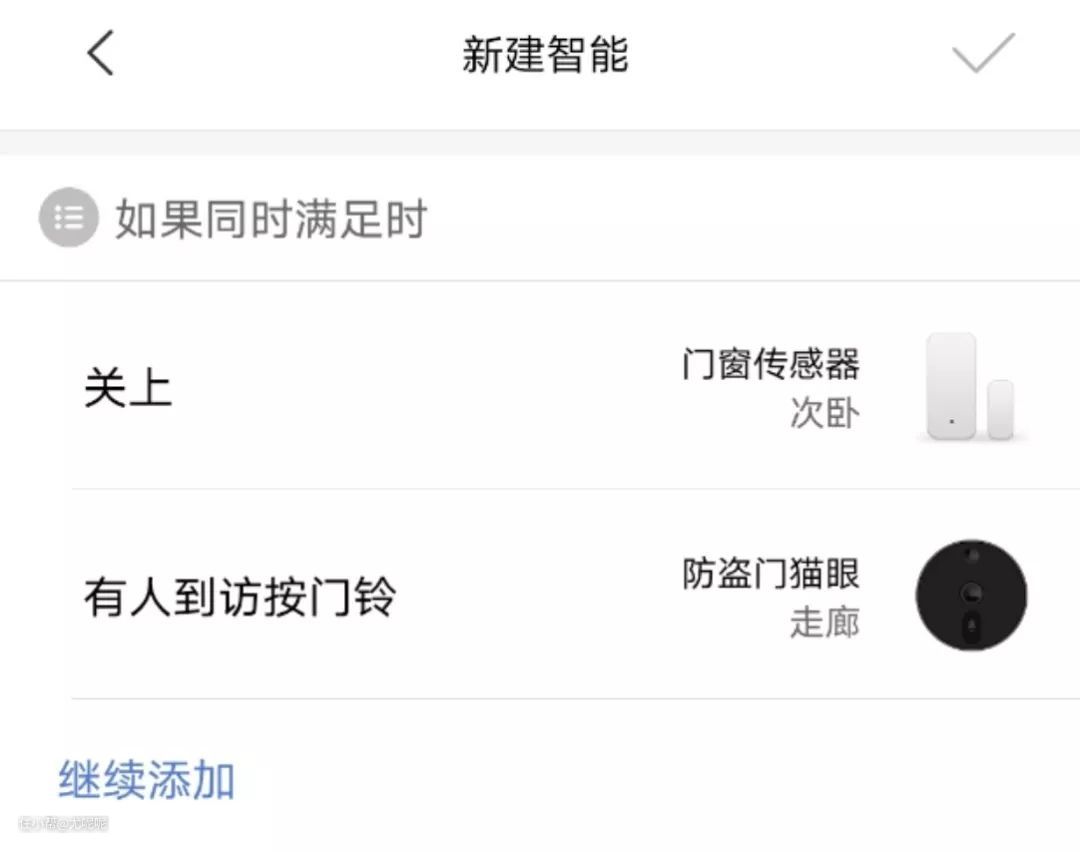 这个的难点在于如何判断家中是否有人,因为猫眼和家中的很多设备都无法同时作为“如果”条件,所以只能增加一个门窗传感器放在门口的盒子上,回家时打开盒子,离家时顺手关上从而判断家中是否有人。