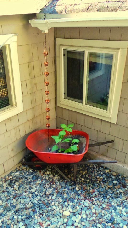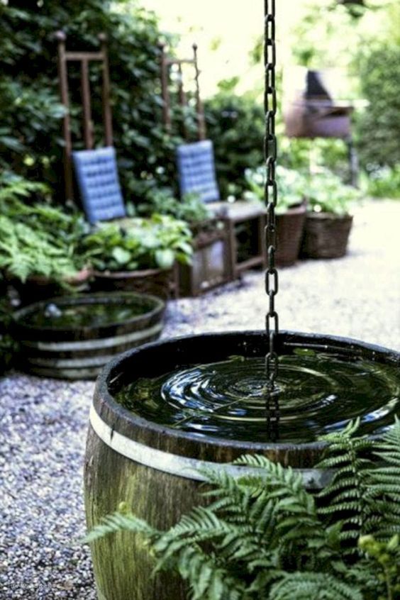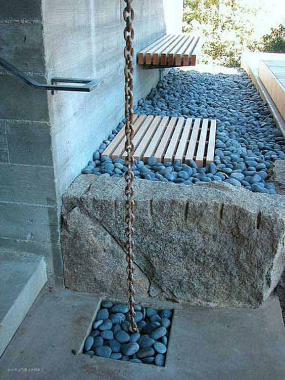 国外很流行在雨链下方挖“坑",然后设计成一个小水景,里面放点鹅卵石,绝对能成为庭院中一道靓丽的风景线,如果空间够宽敞的话,在里面养几条小锦鲤都是没有问题的,其实这种设计主要有两个很好的作用:
